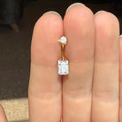 Indulge in luxury with this breathtaking titanium belly button ring, featuring an emerald-cut moissanite that radiates with unmatched brilliance. Each stone is graded **D color—the highest color grade—offering a pure, colorless sparkle that mirrors the beauty of the world’s finest diamonds. With VVS clarity, these moissanites are virtually flawless, ensuring a dazzling display of light with every movement. The total weight of both the 4mm stone on the top and the 7mm main stone is 1.25 carats.