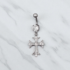Add a touch of vintage elegance to your style with this ornate cross belly button ring, available in both silver and gold finishes—each with its own unique detailing for a one-of-a-kind look. Crafted with high-quality surgical steel, this navel ring features a beautifully designed cross charm that blends classic symbolism with modern sparkle.