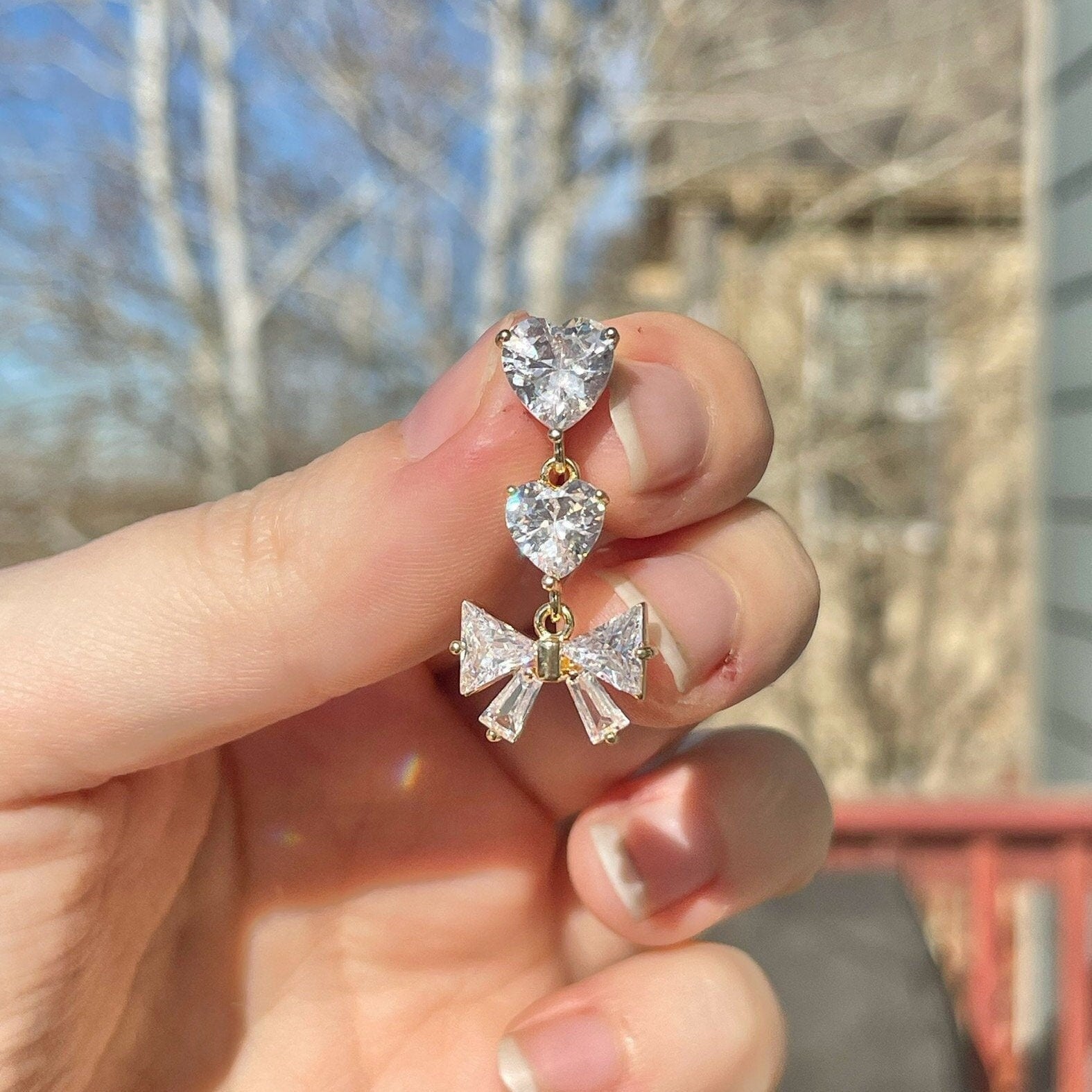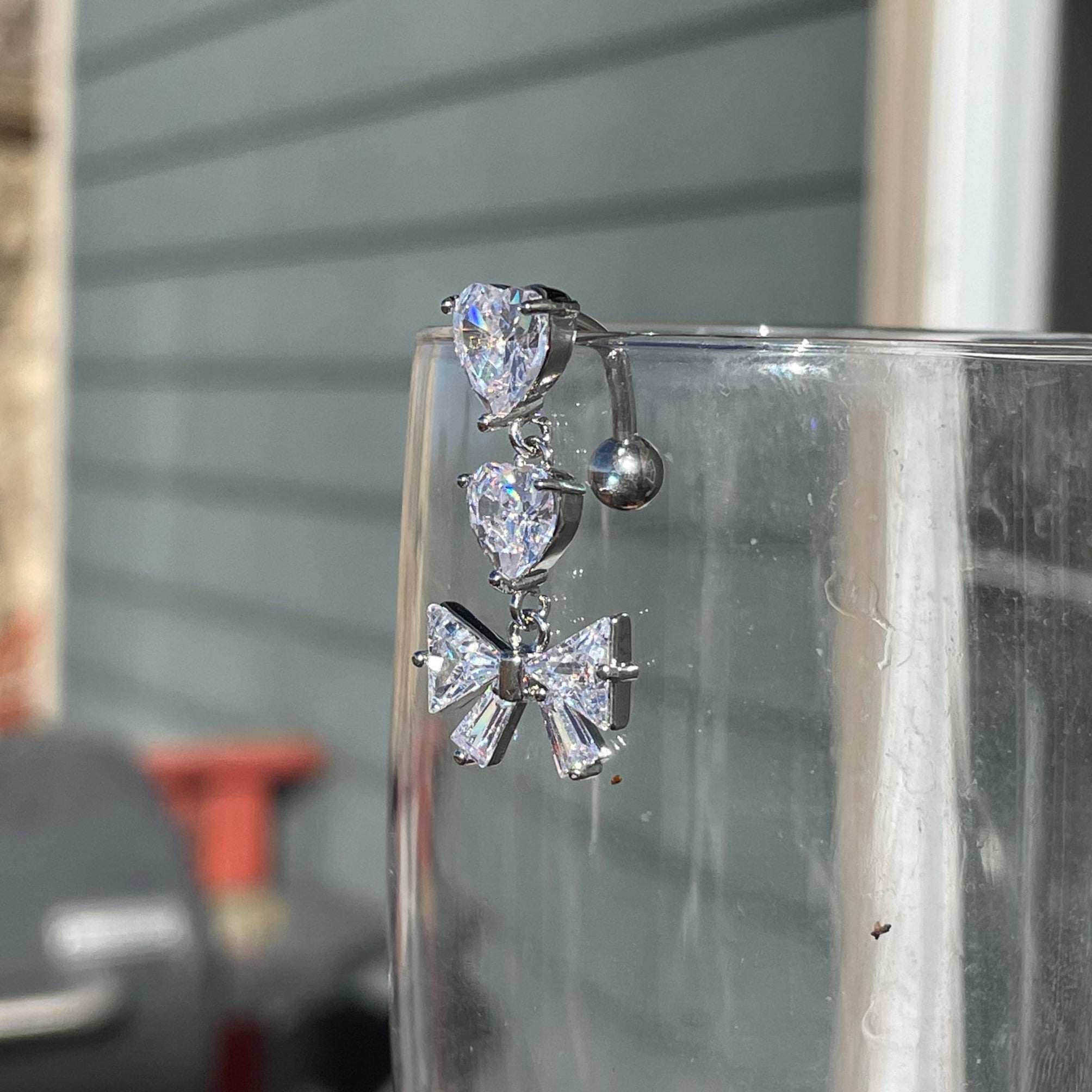 Whether you're looking to add a romantic touch to your body jewelry collection or want to add some sparkle to your outfit, this top-down navel ring with heart-shaped CZs and a bow will make a statement wherever you go.