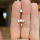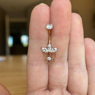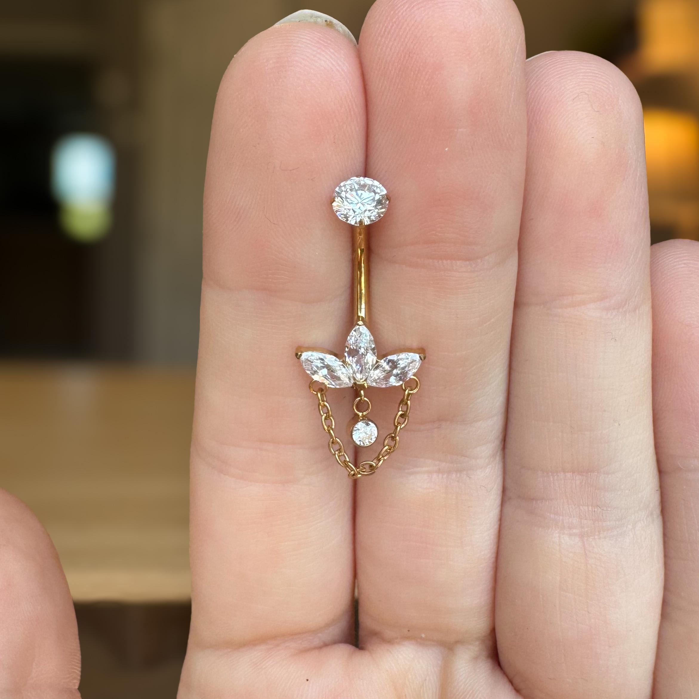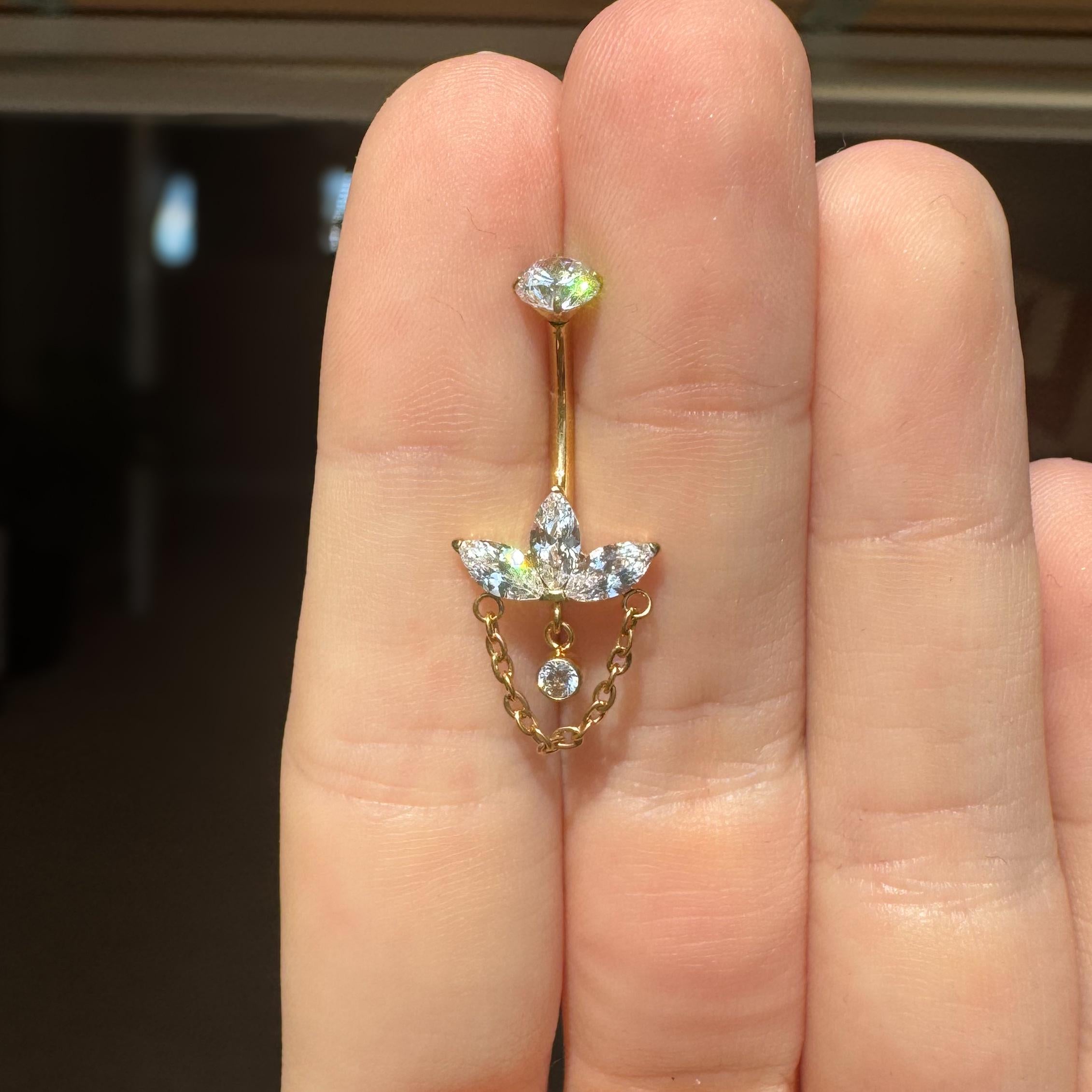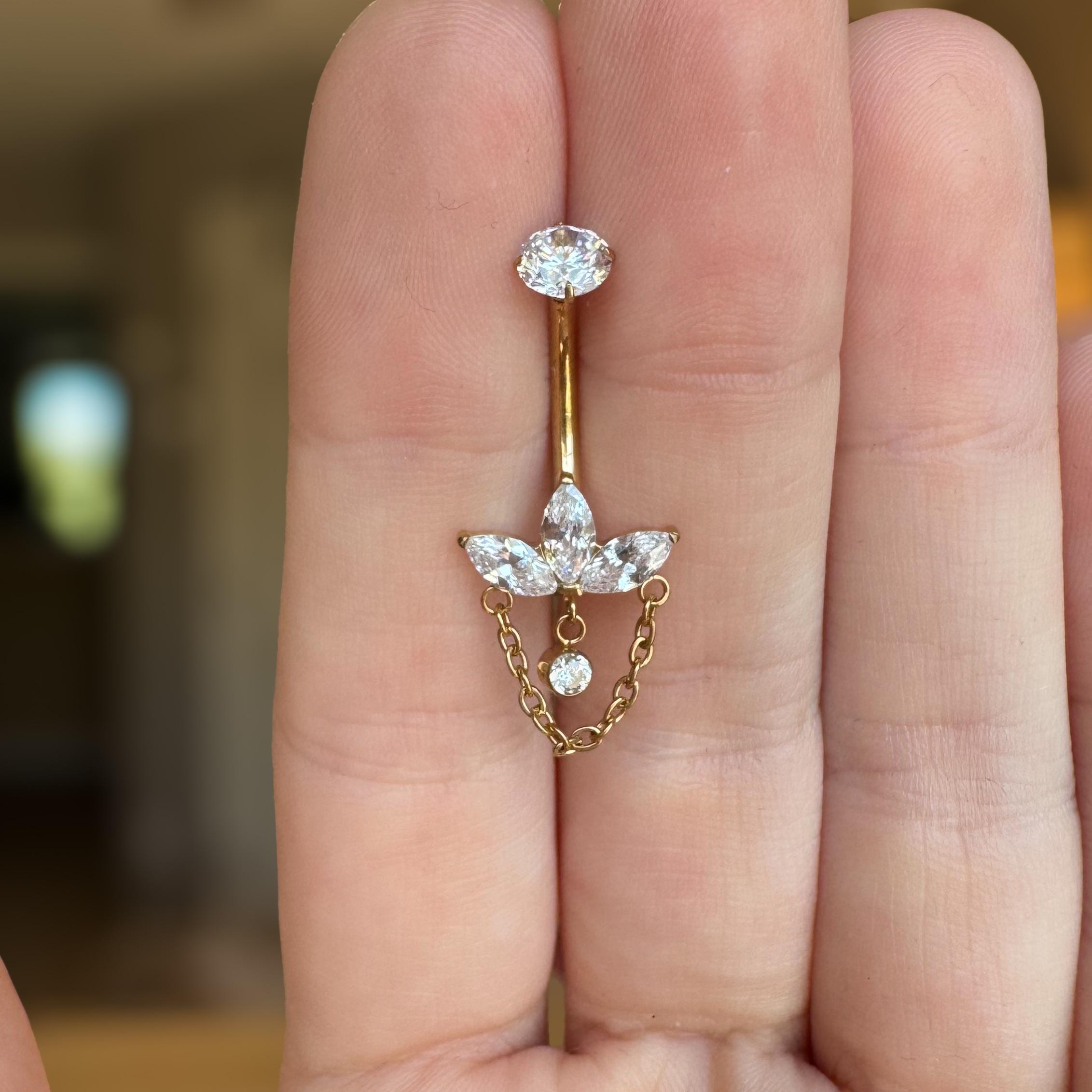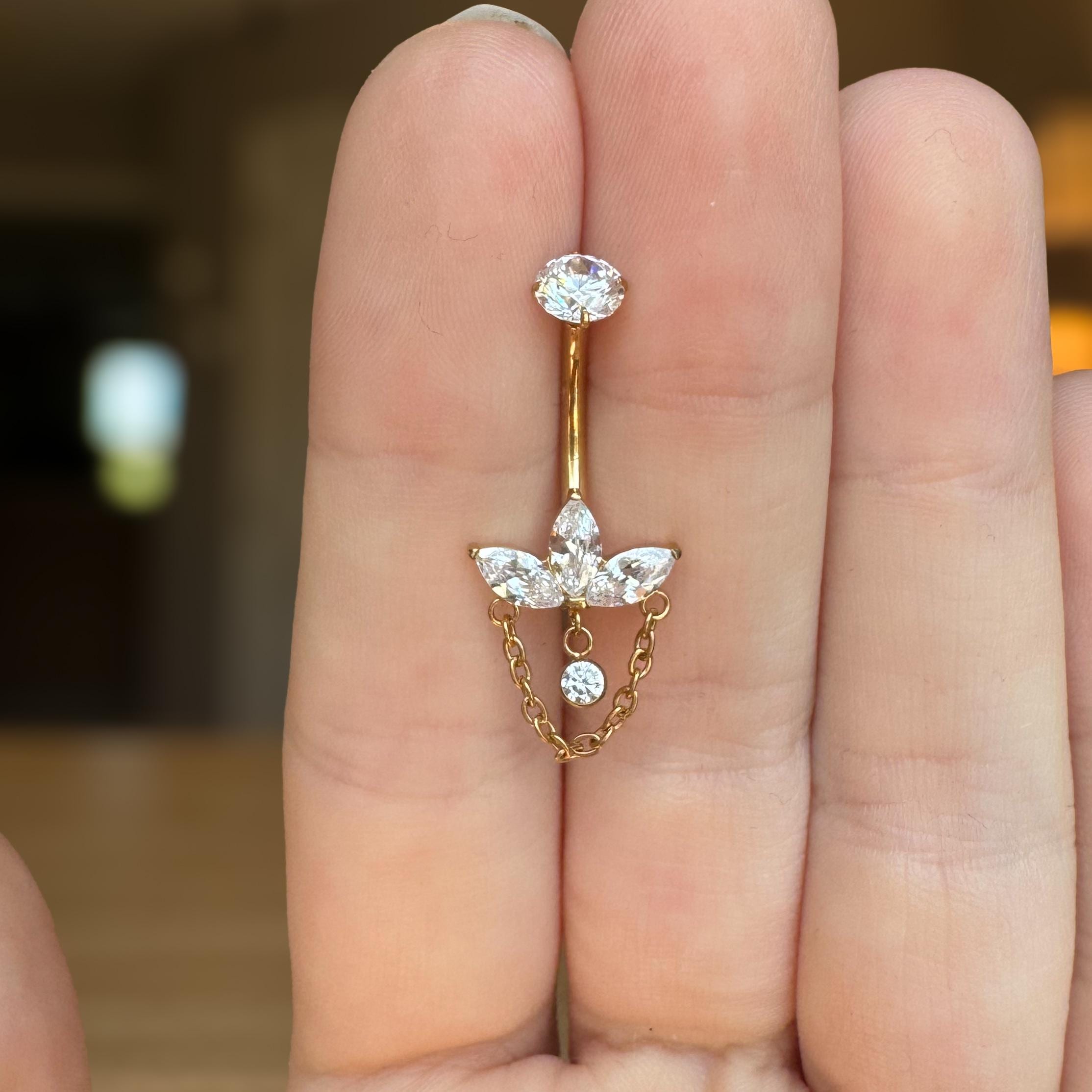 Delicate yet undeniably eye-catching, this internally threaded titanium belly button ring is where elegance meets modern edge. Featuring a trio of sparkling marquise-cut cubic zirconia stones arranged in a graceful crown-like setting, this piece adds a refined shimmer to your look. Suspended below is a dainty gold chain, framing a floating CZ charm that catches the light with every movement.