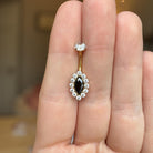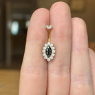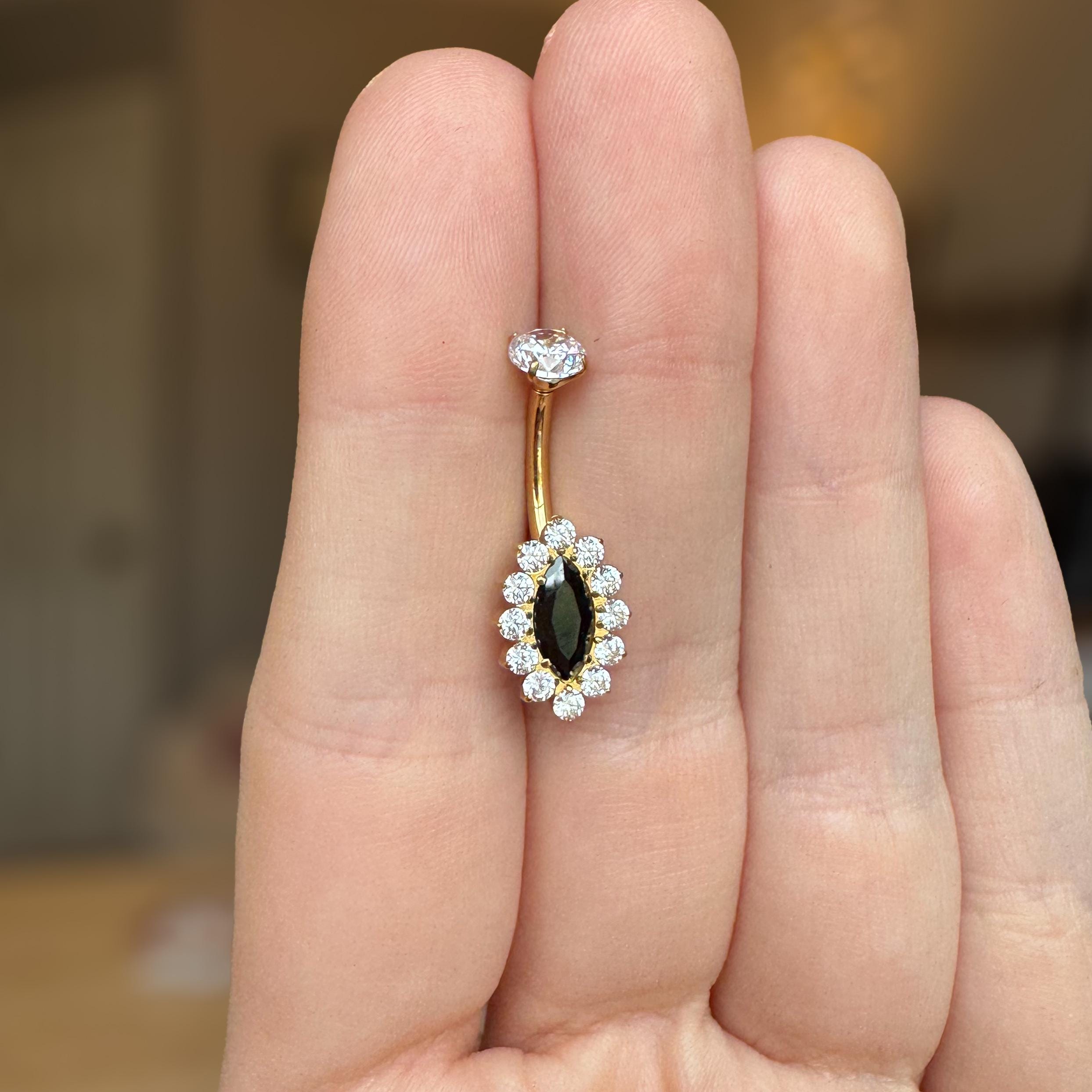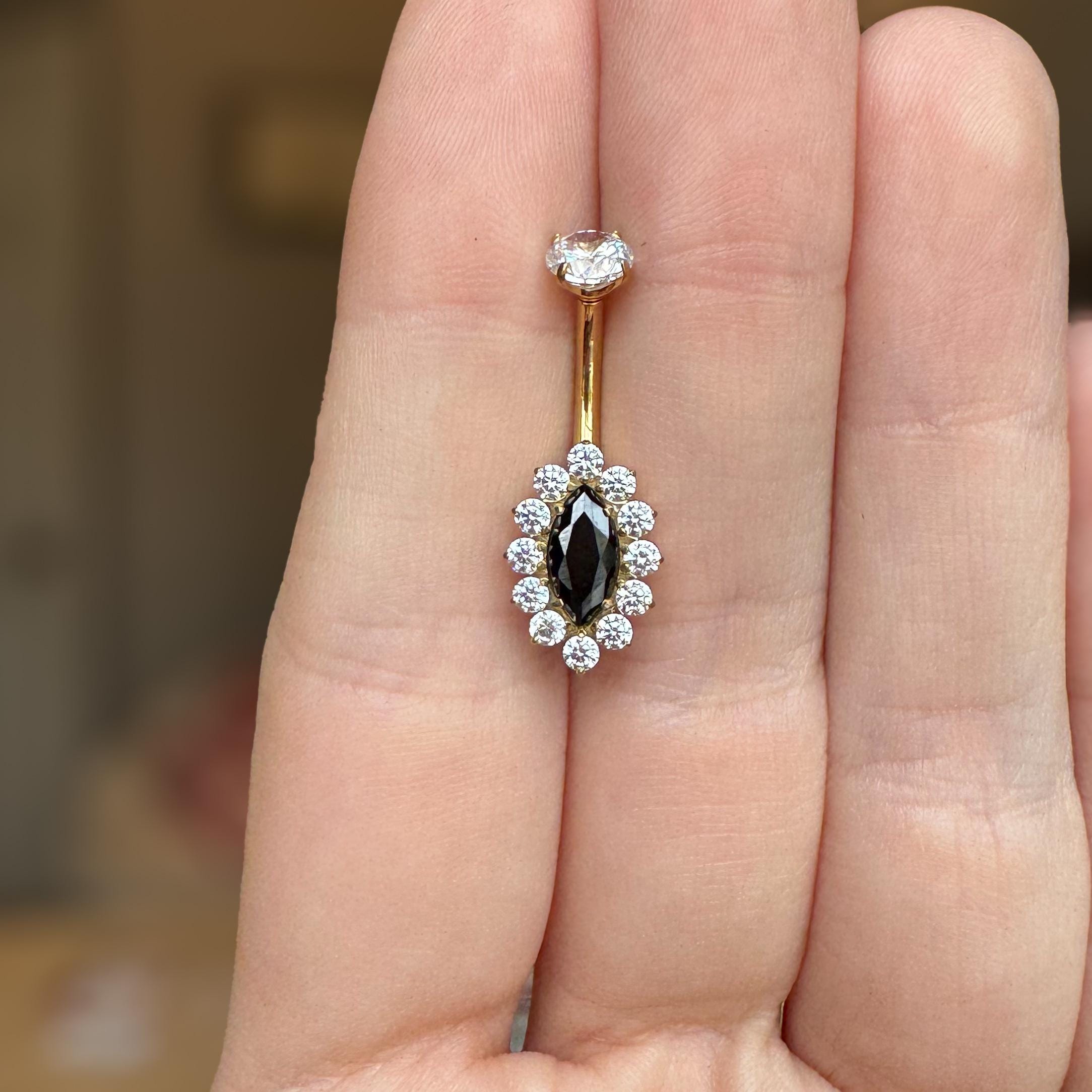 Elevate your belly piercing with this striking yet refined internally threaded titanium belly button ring, designed for both comfort and show-stopping sparkle. At the center of this elegant piece is a sleek black marquise-cut CZ, framed by a radiant halo of clear cubic zirconia—creating a stunning contrast that catches the light from every angle.