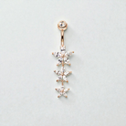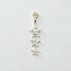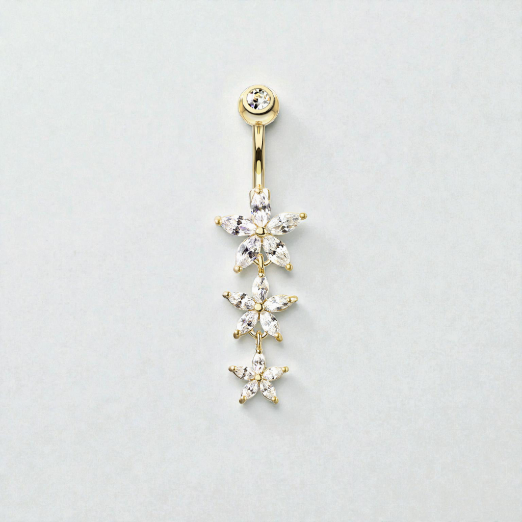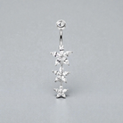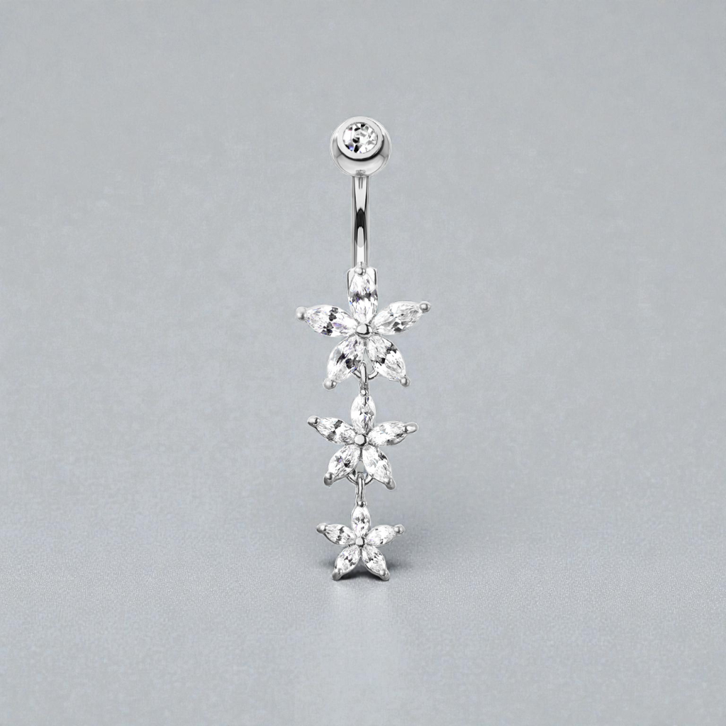 Add a touch of feminine sparkle to your style with this delicate triple-flower belly button ring, featuring a beautiful drop design with three dainty blooms adorned with shimmering cubic zirconia crystals.