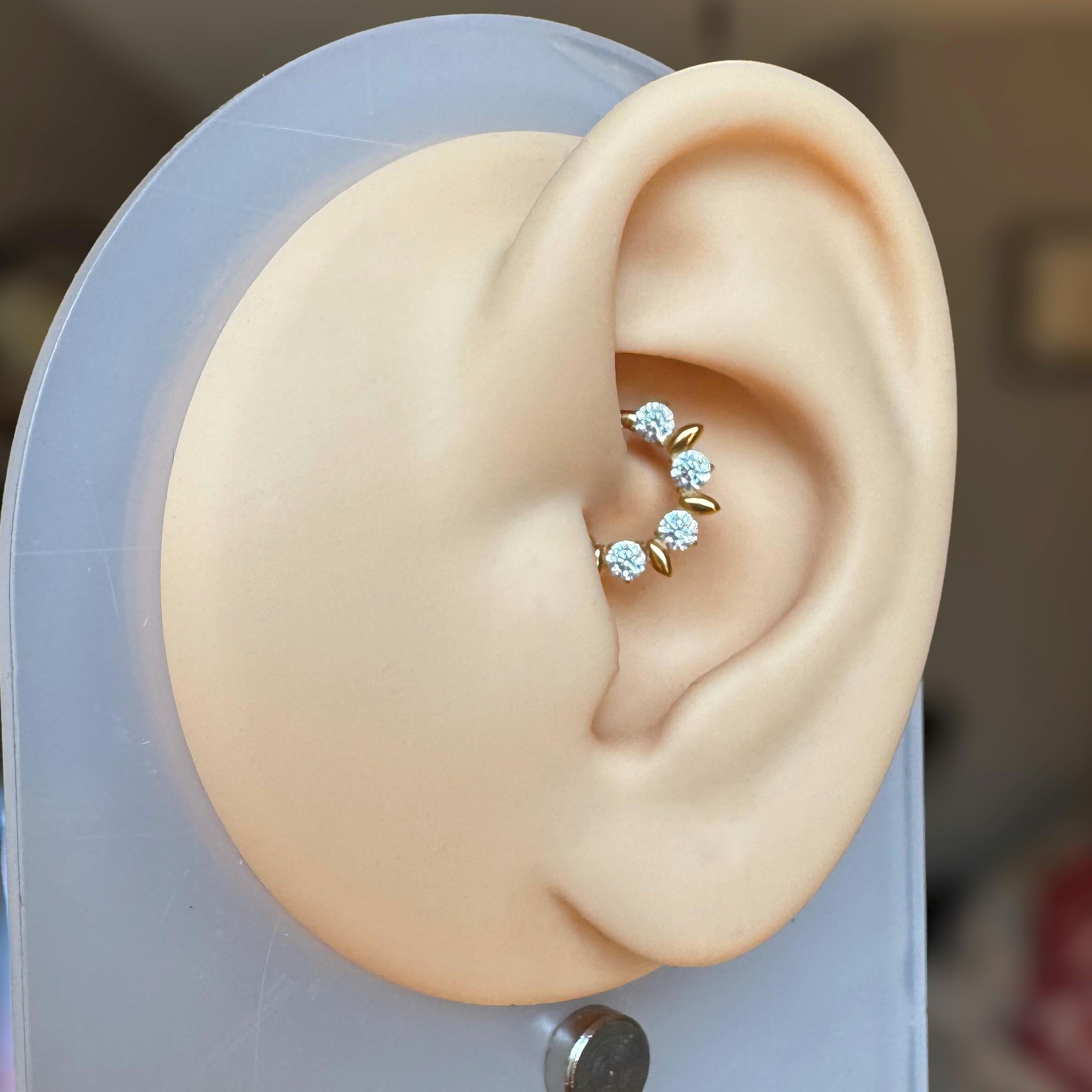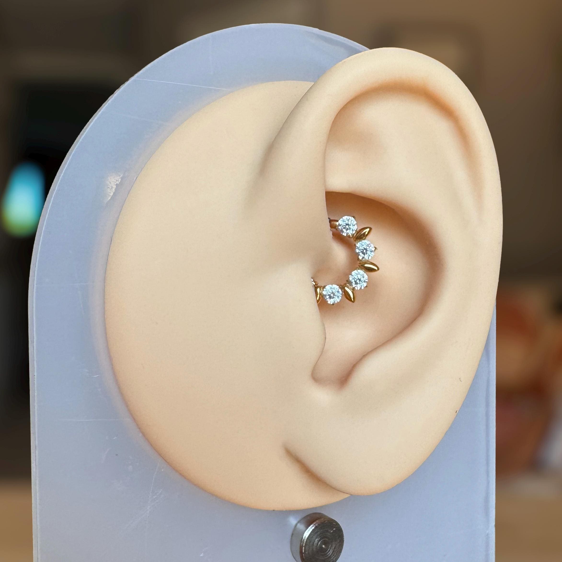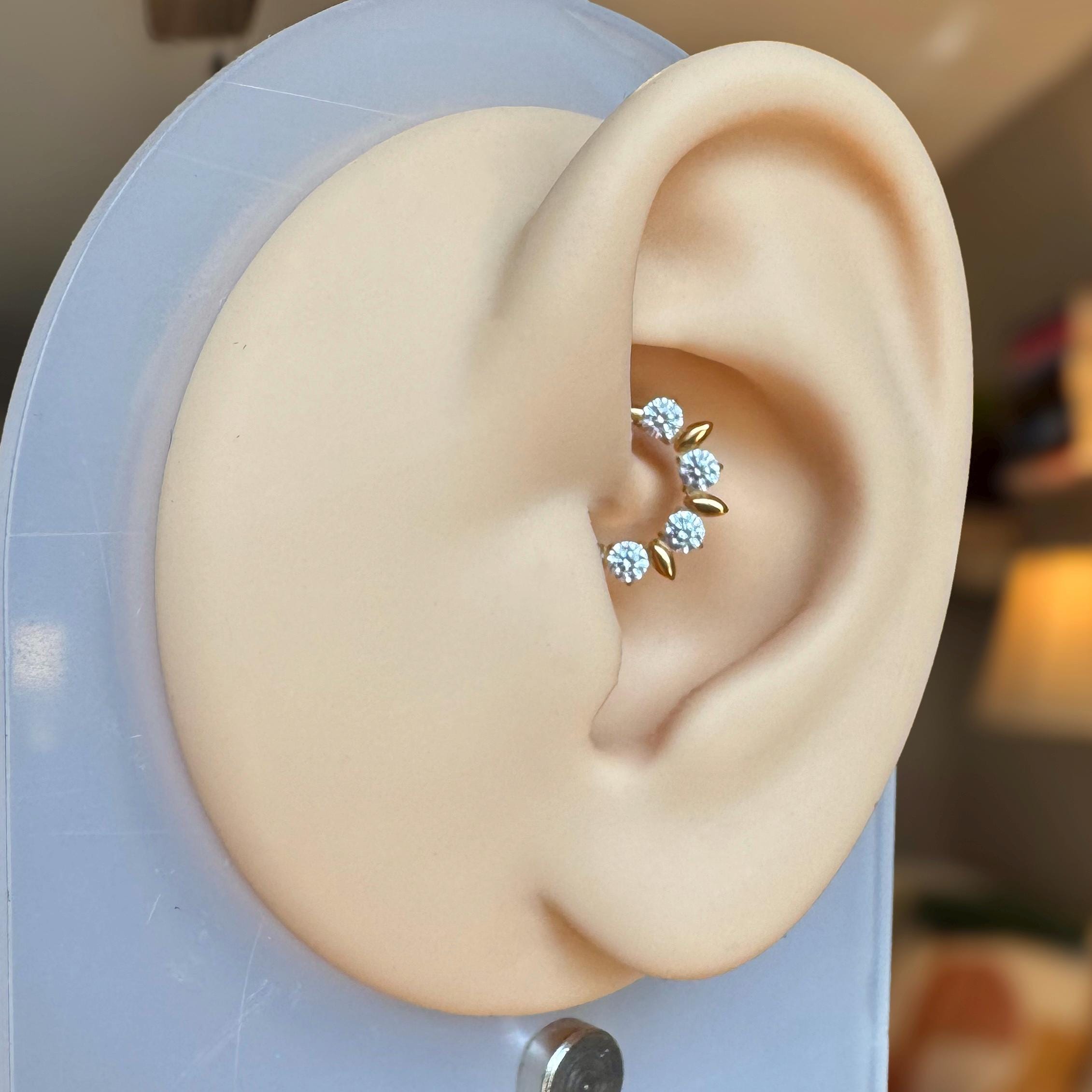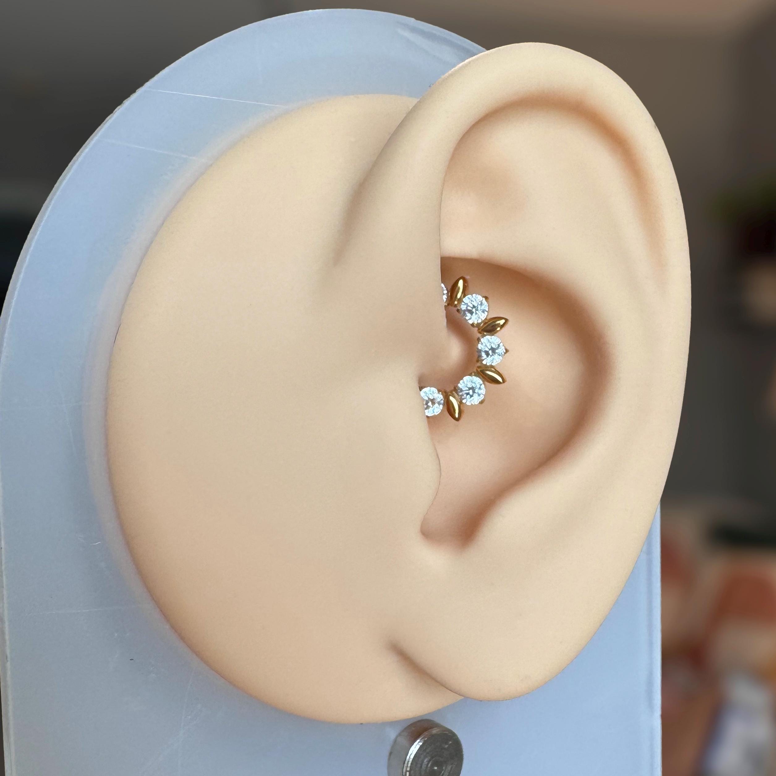 Bold meets delicate in this stunning titanium daith earring, a radiant piece designed to turn heads. Crafted from implant-grade titanium and available in gold or silver, this hinged clicker features a row of shimmering cubic zirconia stones accented by sleek, dainty marquise-shaped spikes nestled between each gem.