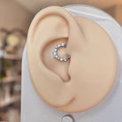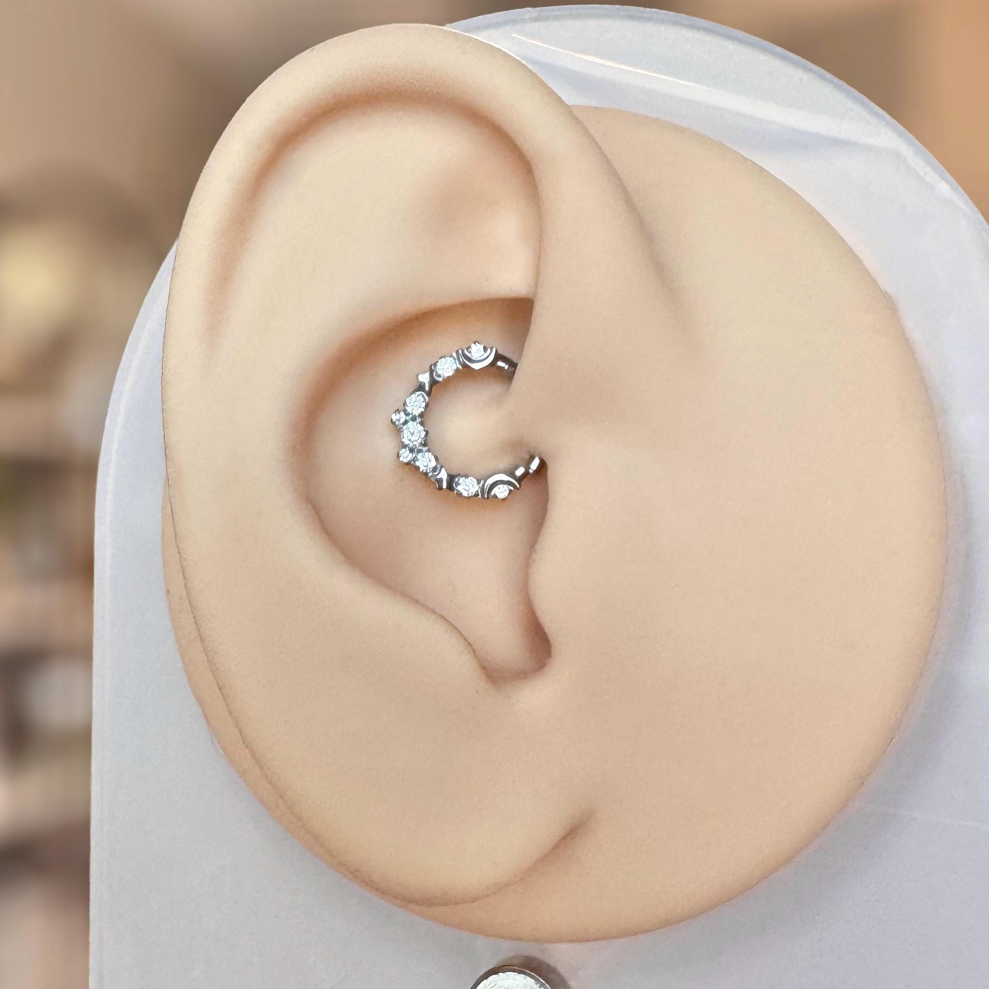 Delicate and celestial, this titanium daith earring captures the magic of the night sky in a radiant, wearable design. Tiny moons and stars dance along the curve of the hoop, glimmering between brilliant CZ crystals that add a touch of starlight sparkle.
