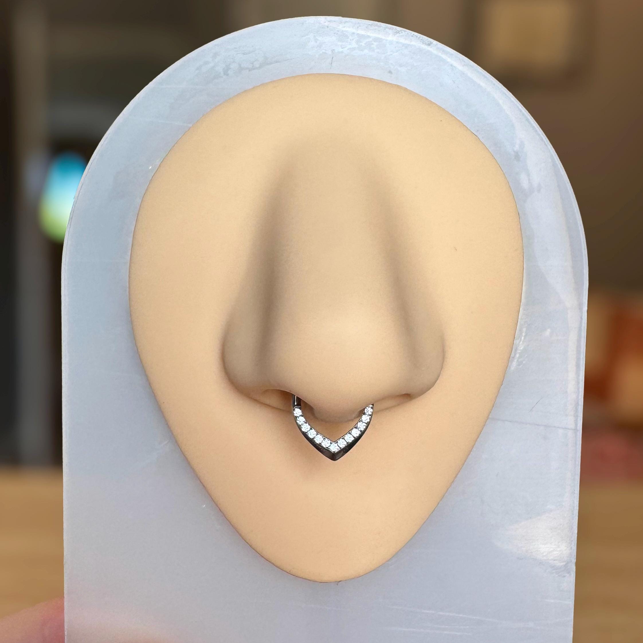 Sleek, sculptural, and designed to shimmer—this septum ring features a modern teardrop-inspired V-shape encrusted with sparkling cubic zirconia stones along the lower curve. Crafted from implant-grade titanium and available in your choice of gold or silver, this piece brings a perfect balance of minimalism and radiance.