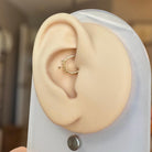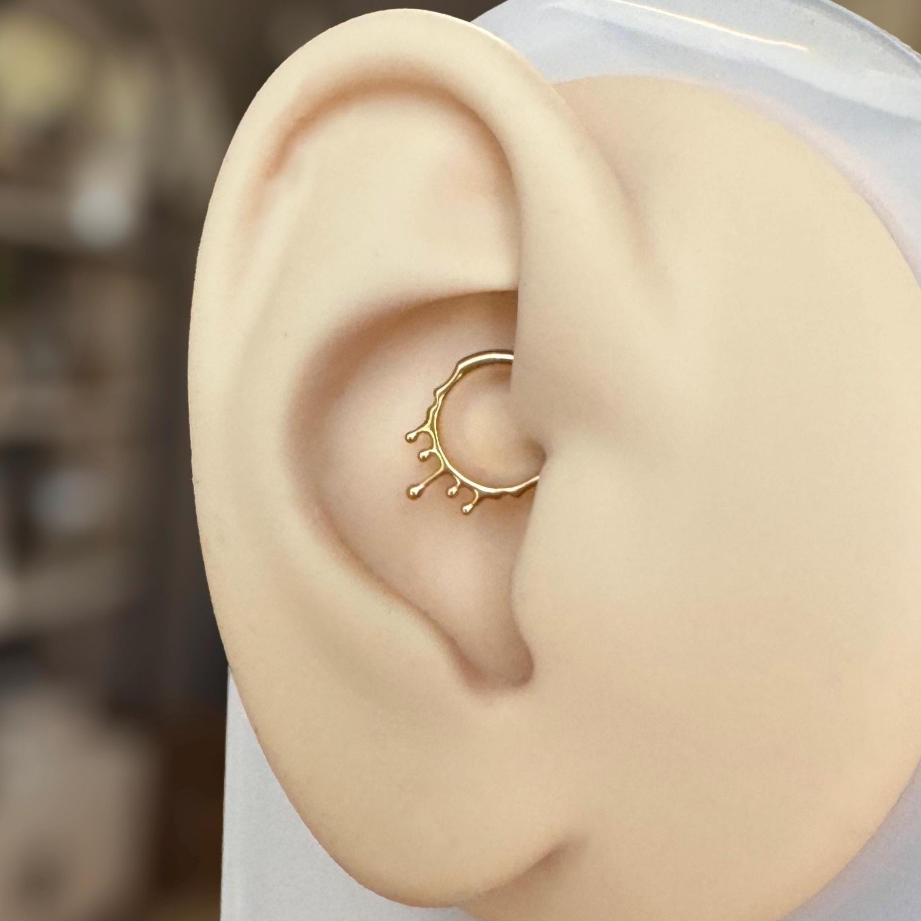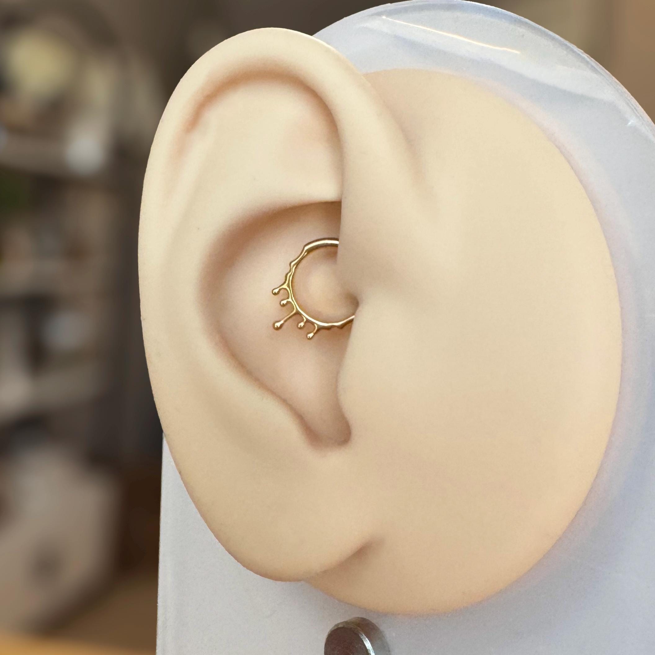 Modern, artistic, and effortlessly cool, this titanium daith earring features a unique drip-inspired design that gives the illusion of liquid metal flowing gracefully along the hoop. The smooth, sculptural “drops” create a striking silhouette—minimal yet full of movement and personality. Crafted from implant-grade titanium, this piece is lightweight, and made for all-day comfort. The hinged clicker closure ensures easy insertion and a secure, seamless fit, while the choice of silver, black, or gold finish makes it easy to match your personal style.