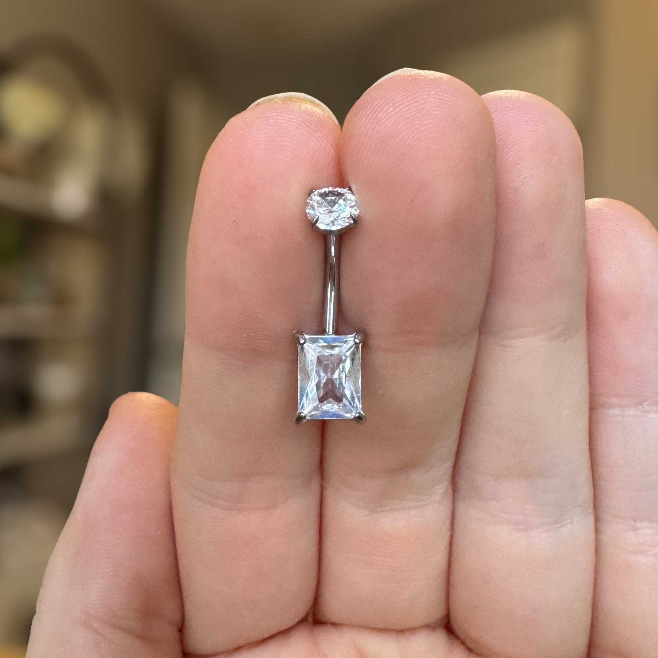 Simple, refined, and effortlessly modern, this belly button ring features a sleek rectangular CZ crystal at its center, paired with a classic CZ top for balanced, understated sparkle. The clean lines of the rectangular stone create a minimalist silhouette that feels contemporary and timeless at the same time.