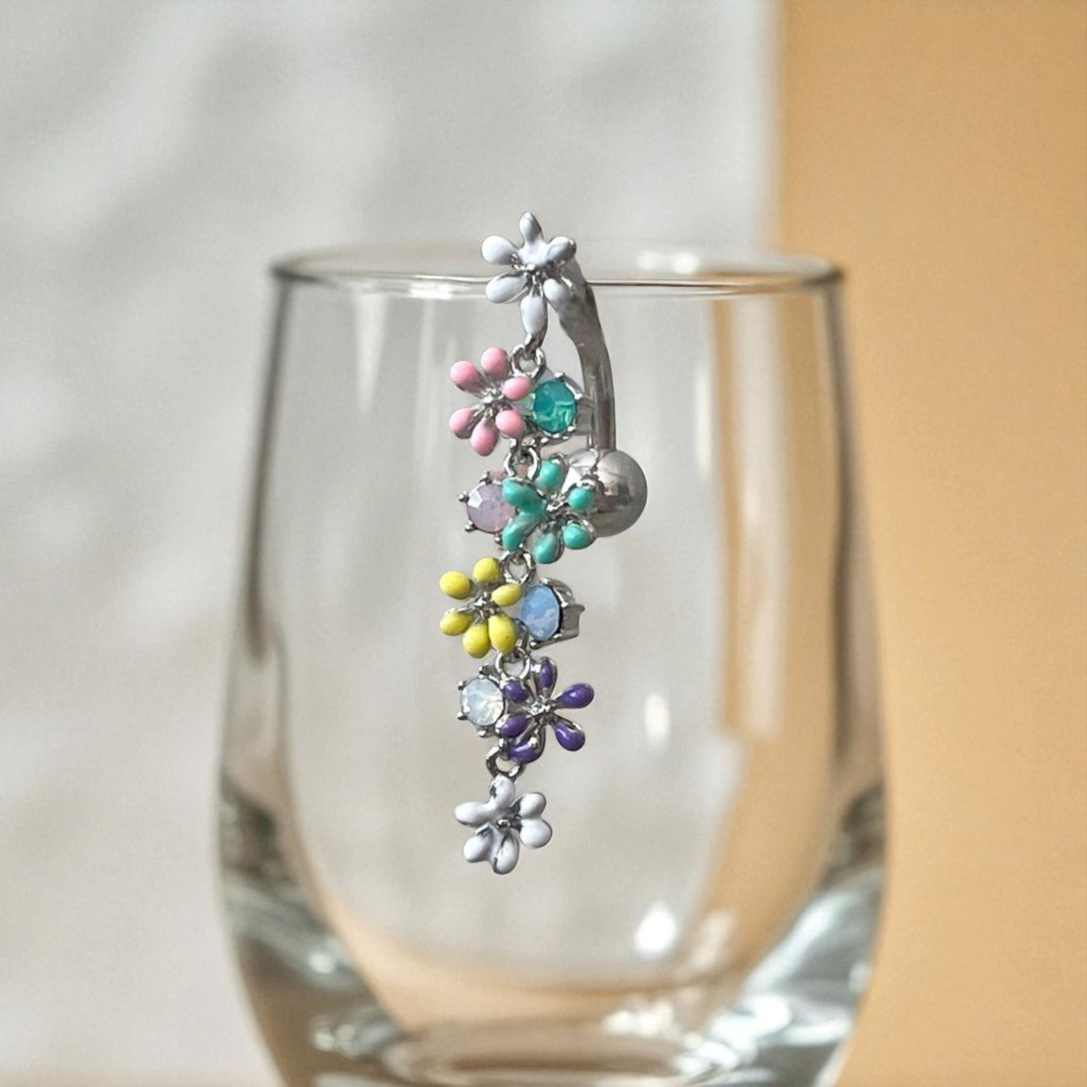 Add a touch of floral elegance to your belly piercing with this top-down belly button ring, designed in a delicate string of flowers and sparkling crystals. This reverse-style navel ring dangles gracefully from the top, offering a fresh, eye-catching twist on traditional belly jewelry.