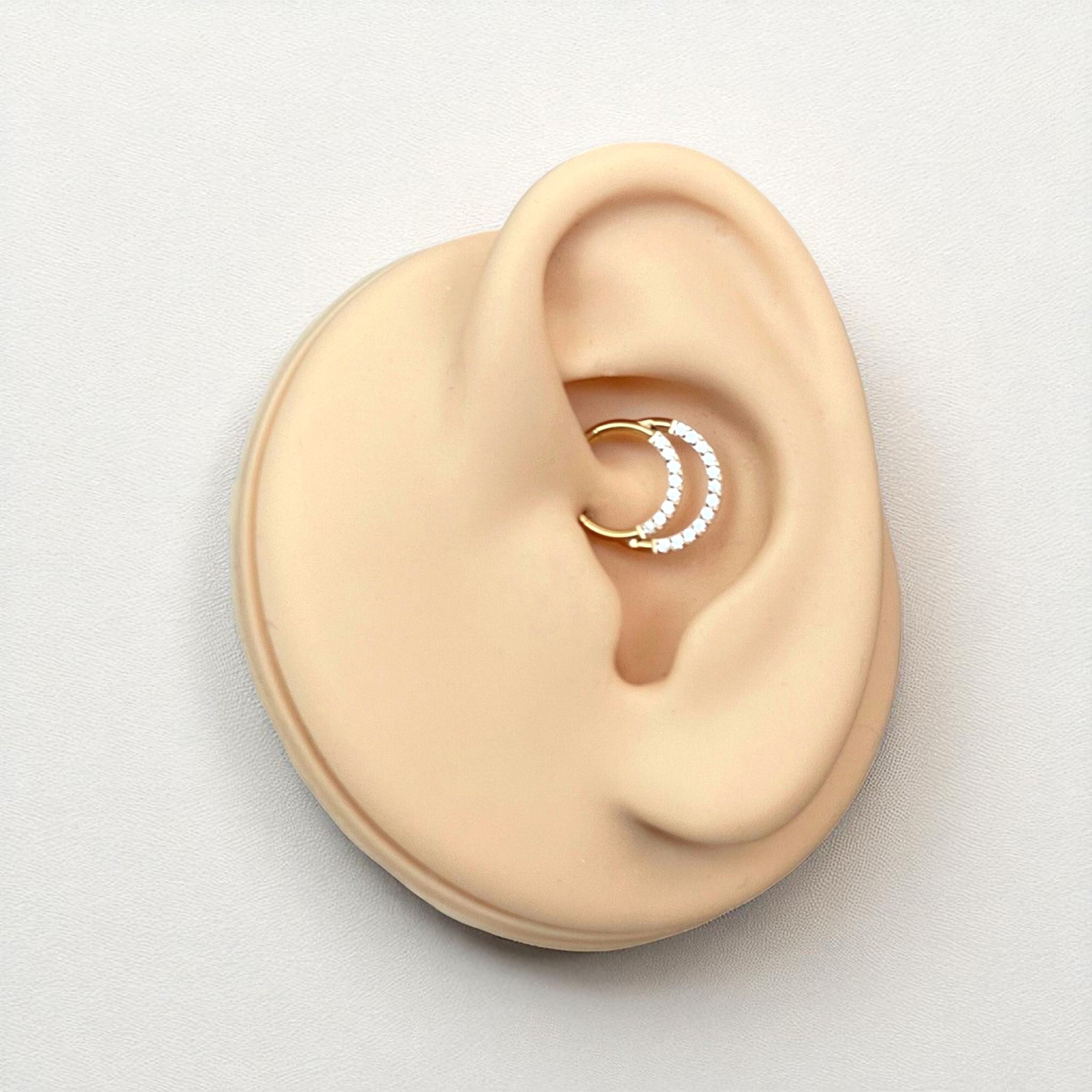This high-quality daith earring is constructed from implant-grade titanium. It features a two-hoop design and your choice of 6mm, 8mm, and 10mm inner diameter options for a personalized look. It is available in either silver or gold and adorned with dazzling CZs.