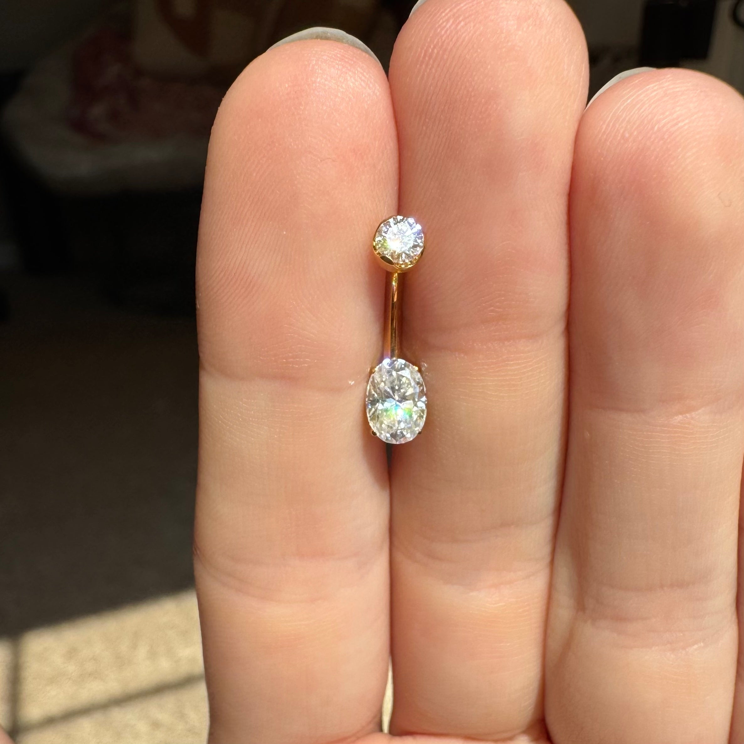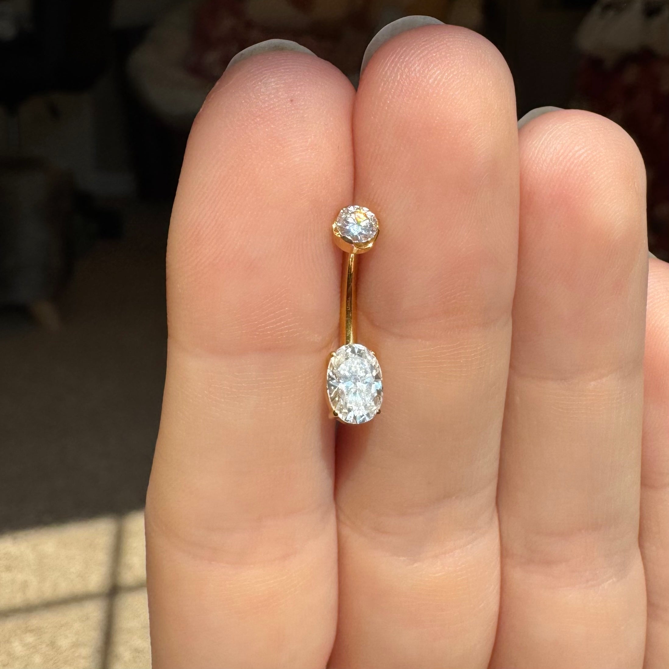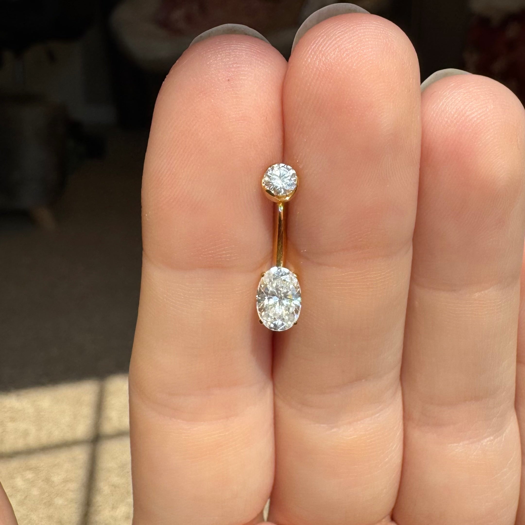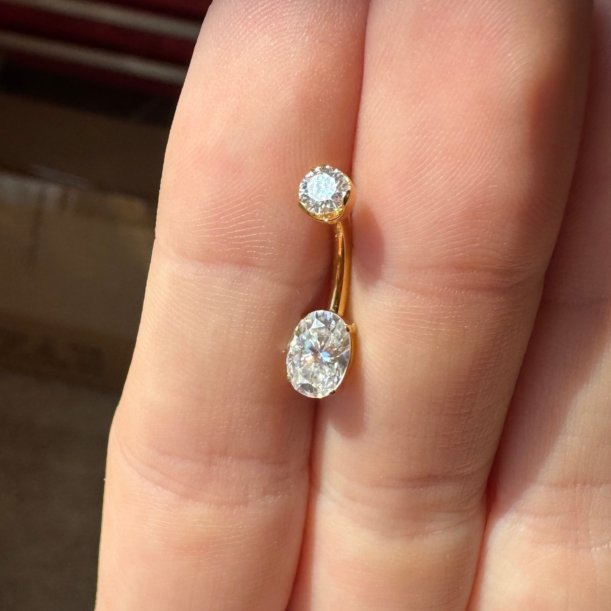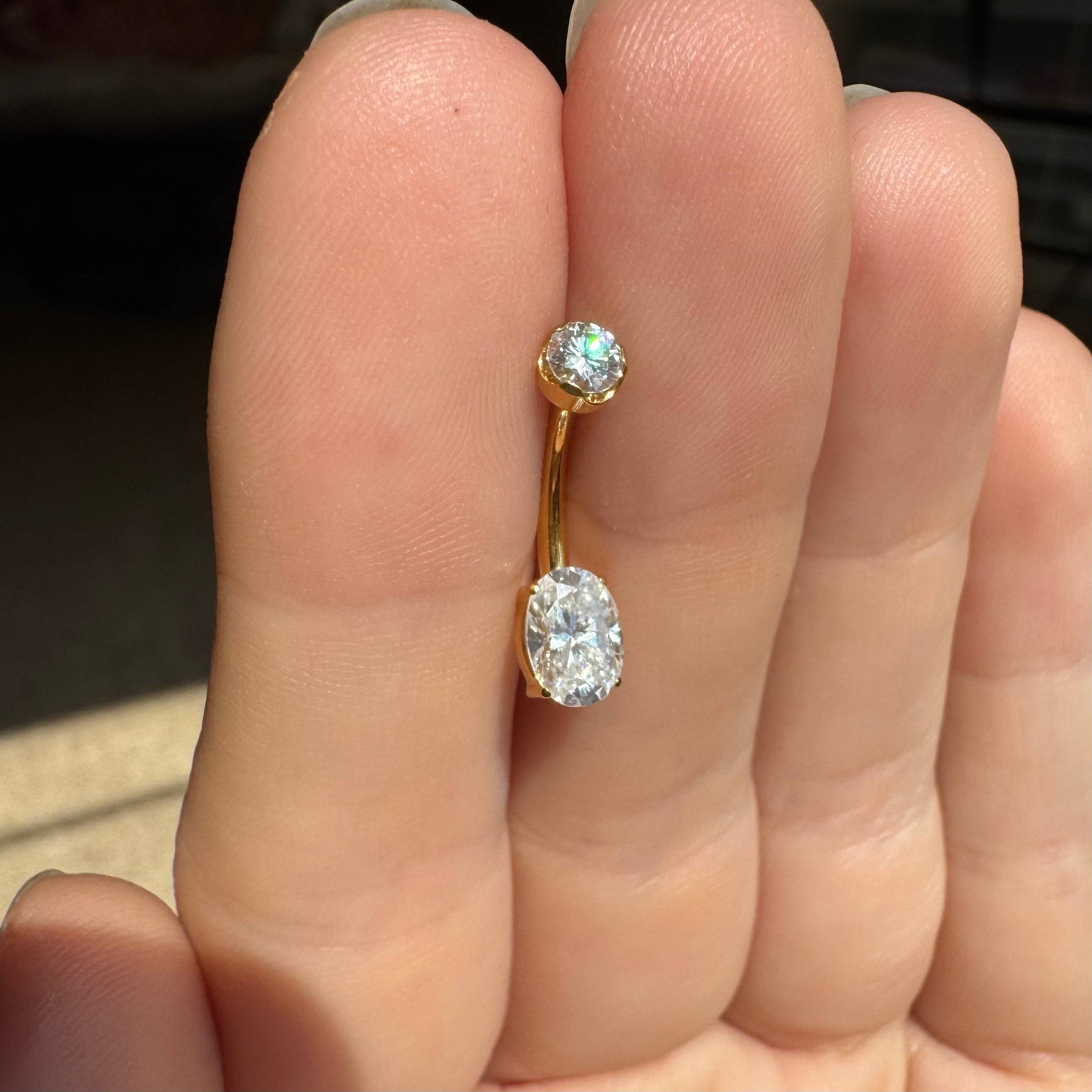The oval-cut moissanite provides a soft, romantic shape with dazzling fire, making it perfect for those who love jewelry with both sophistication and sparkle. Designed for everyday wear yet elevated enough for special occasions, this belly button ring is a true statement of luxury.