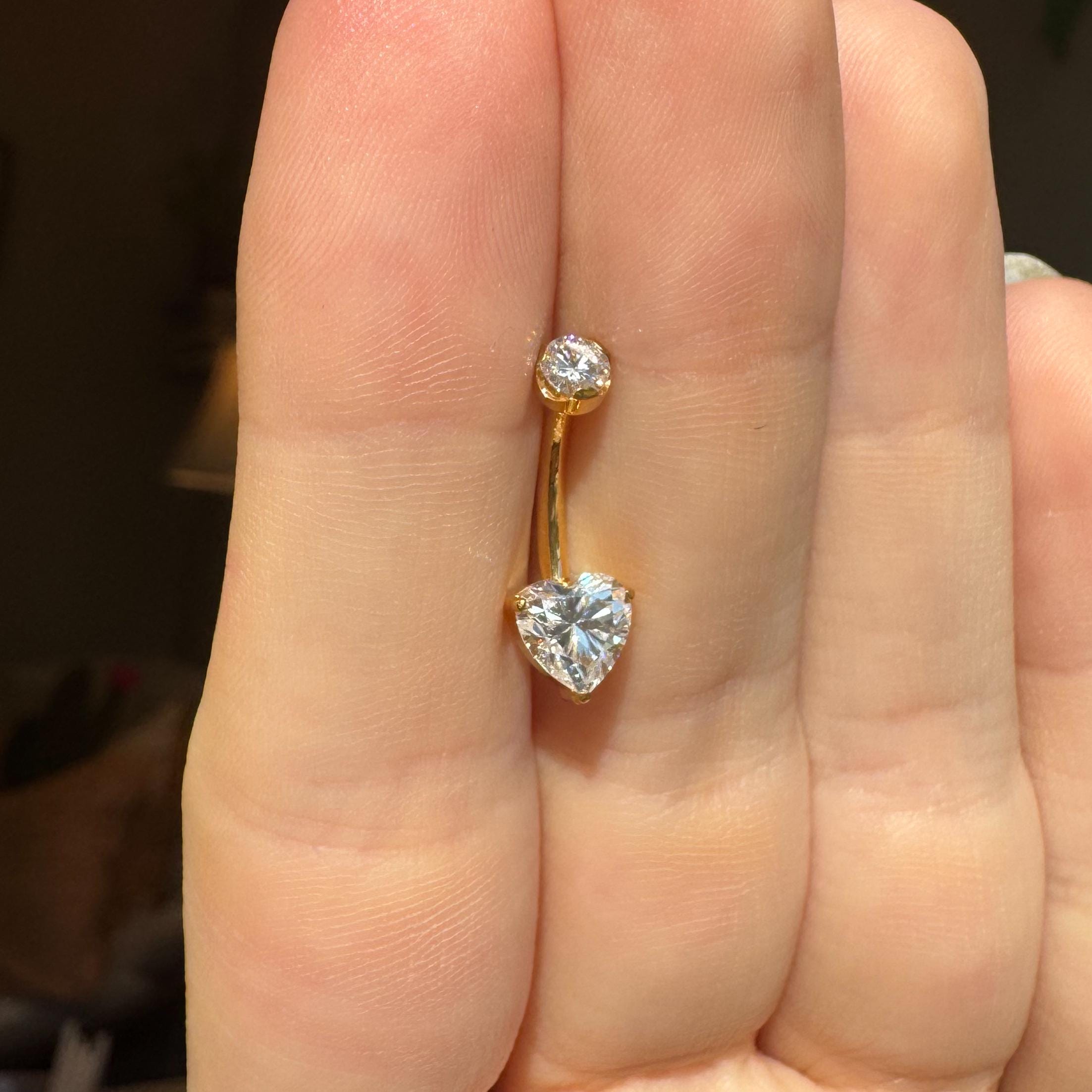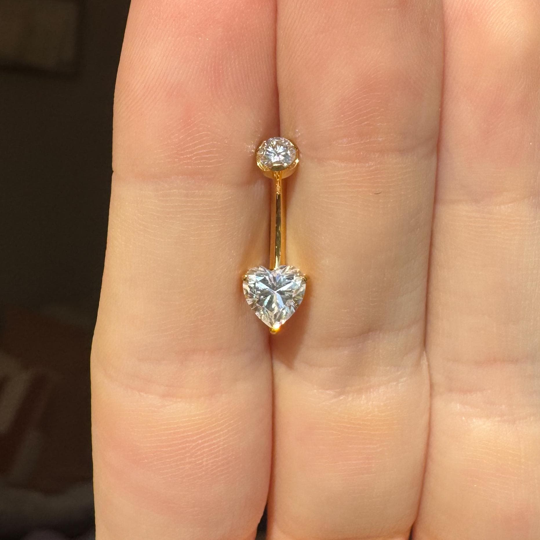 Radiant and timeless, this titanium heart belly button ring strikes the perfect balance between sentiment and sophistication. A brilliant heart-cut Moissanite sparkles at the center, complemented by a round Moissanite top for a touch of symmetry and shine.