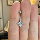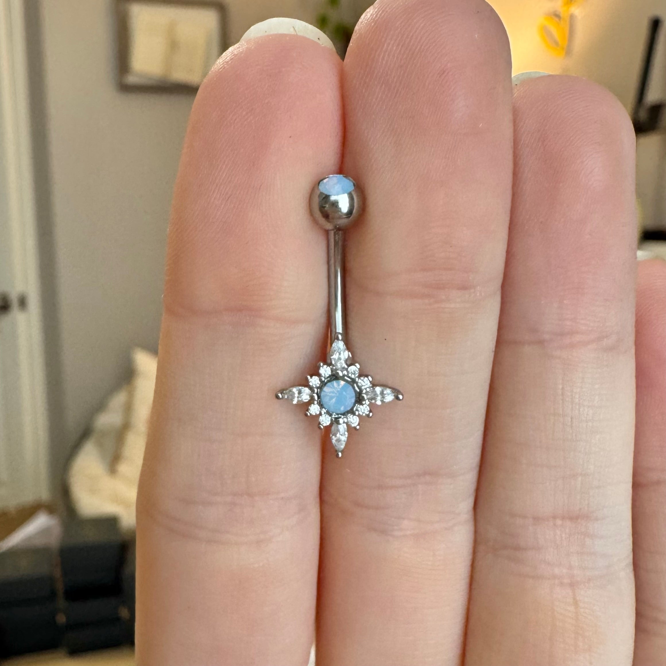 Shine like the night sky with this dazzling starburst belly button ring, designed with radiant CZ crystals and dreamy faux opals.