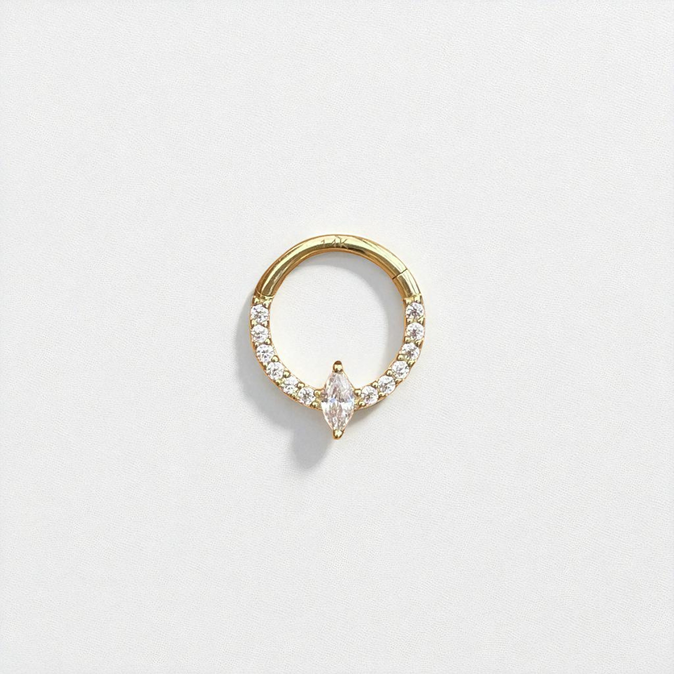 This 16G solid gold daith ring features a marquise-cut inset CZ and a secure click closure design. Its sleek, minimalist look is sure to turn heads and make a lasting impression.