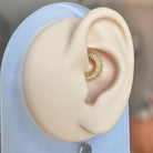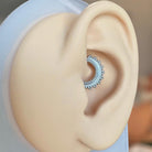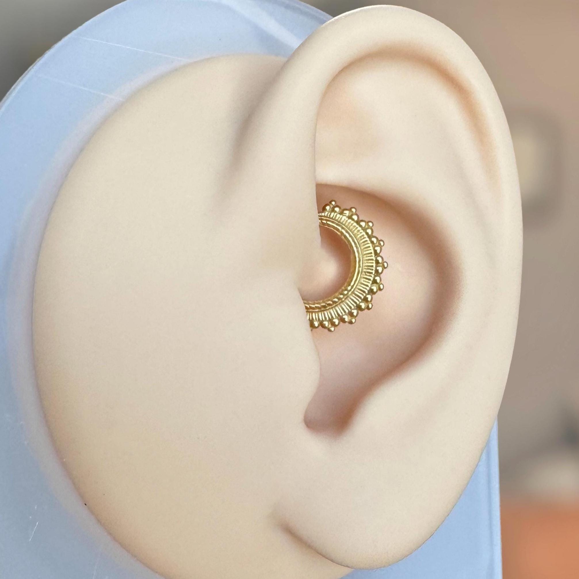Striking and sophisticated, this daith earring features a radiant fan-inspired design detailed with intricate texture and polished beaded edges. Crafted from high-quality surgical steel, it’s available in your choice of gold or silver, offering both unique style and a luxurious shine. Its hinged clicker closure allows for easy, secure wear while maintaining a smooth, seamless fit.