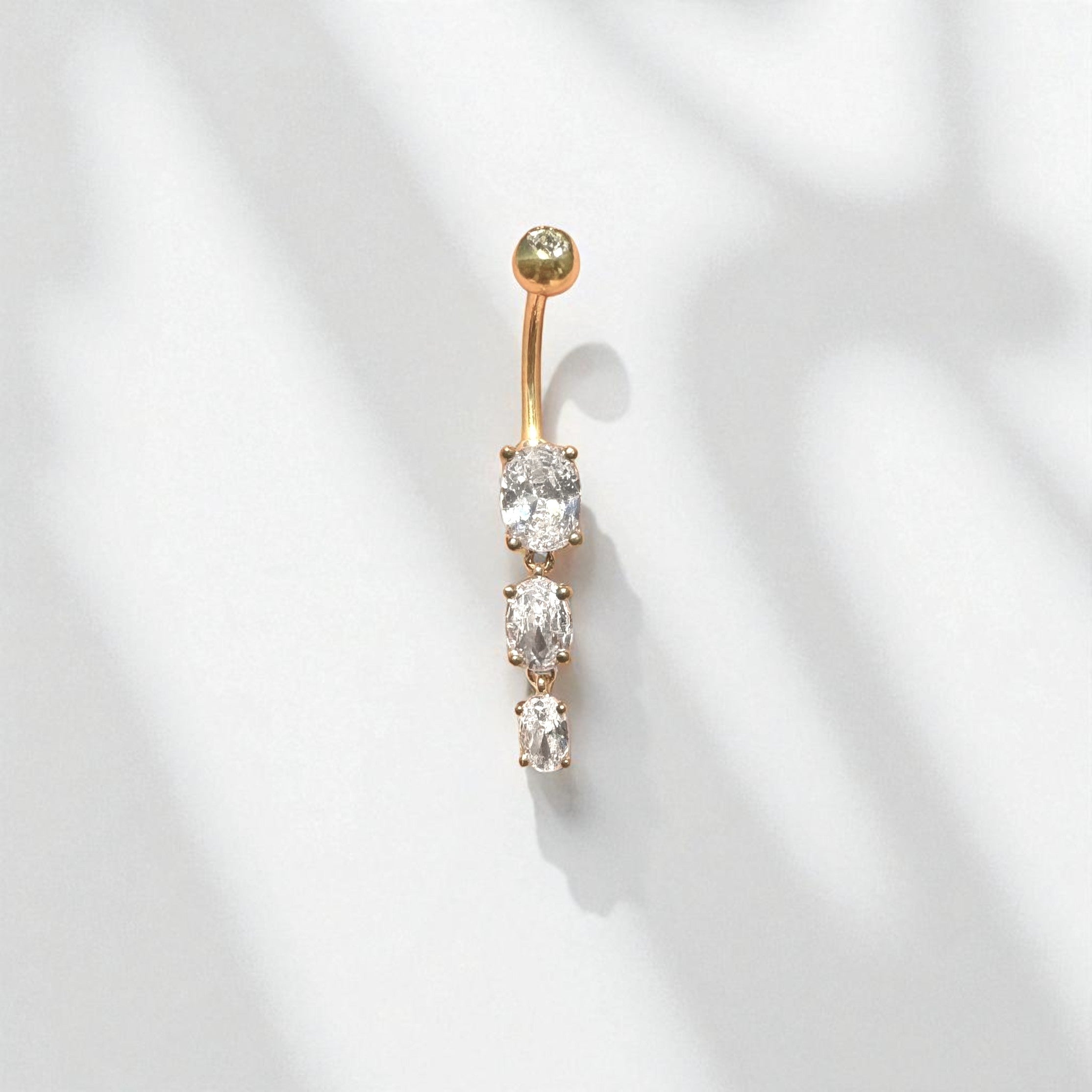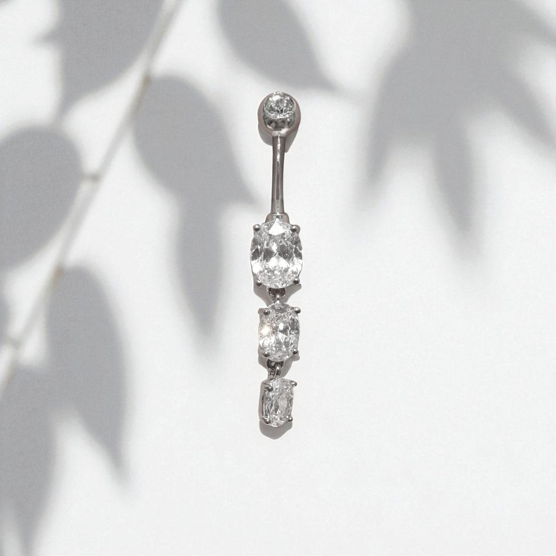 Elegant and eye-catching, this belly button ring brings just the right amount of sparkle to your look. Featuring three dazzling oval-cut cubic zirconia crystals that dangle gracefully, this piece is a stunning addition to any navel piercing collection.