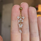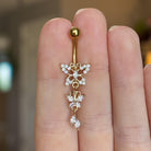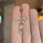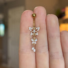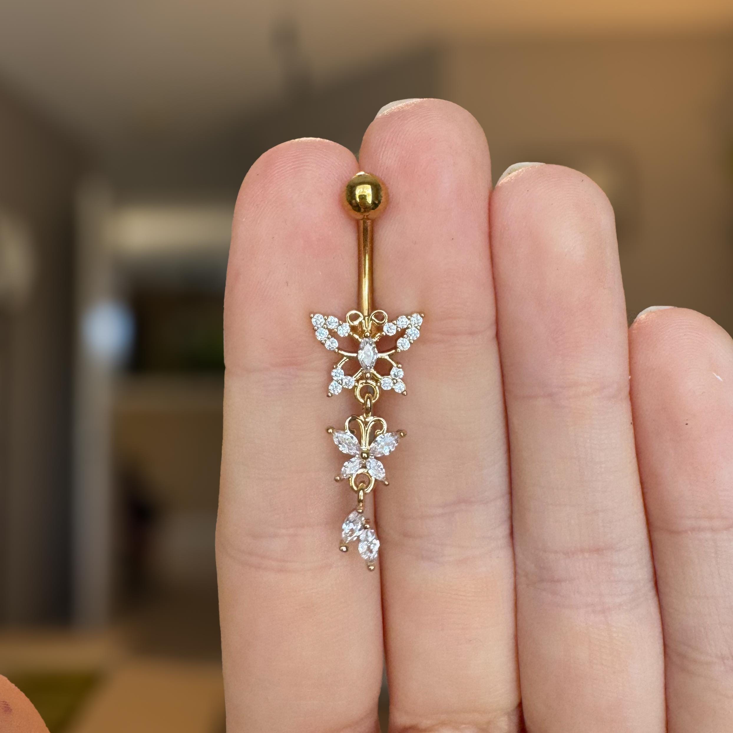 Delicate, feminine, and full of movement, this butterfly belly button ring captures the perfect balance of dainty elegance and radiant sparkle. Two graceful butterfly charms cascade beautifully along the drop, each one shimmering with fine detail, while dangling CZ crystals below catch the light with every movement. Crafted from high-quality surgical steel and finished in your choice of silver or gold, this piece is designed for both beauty and comfort.