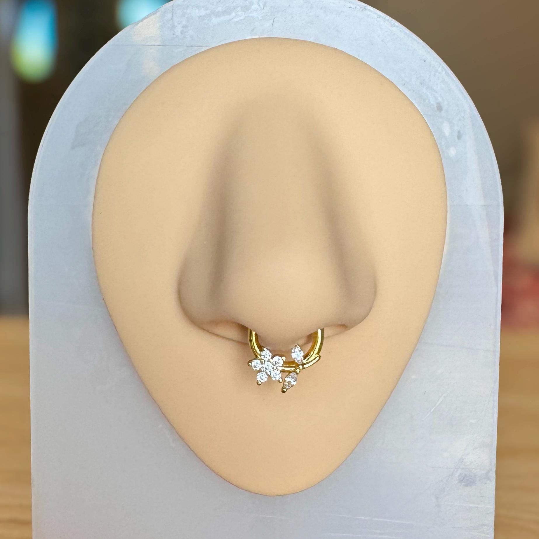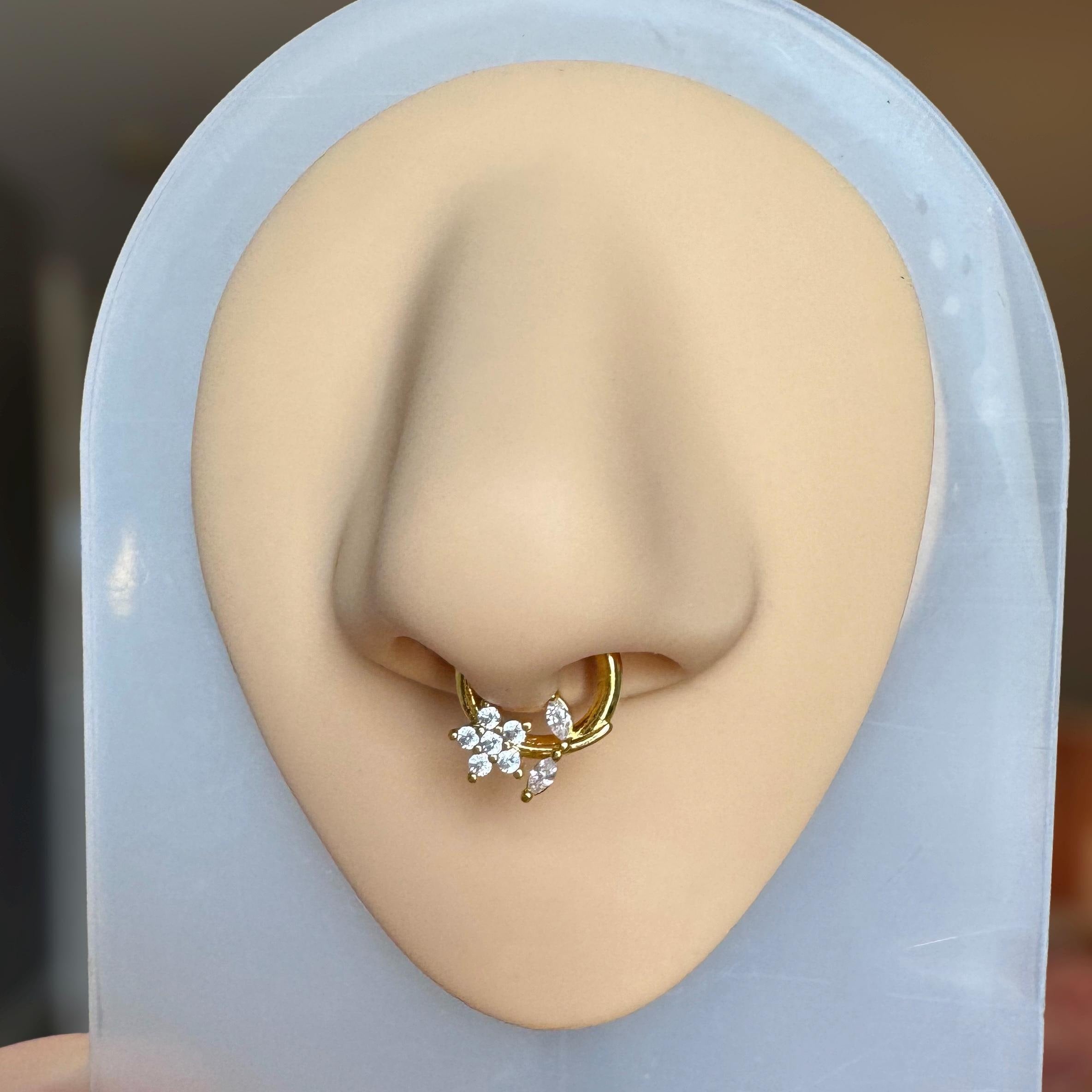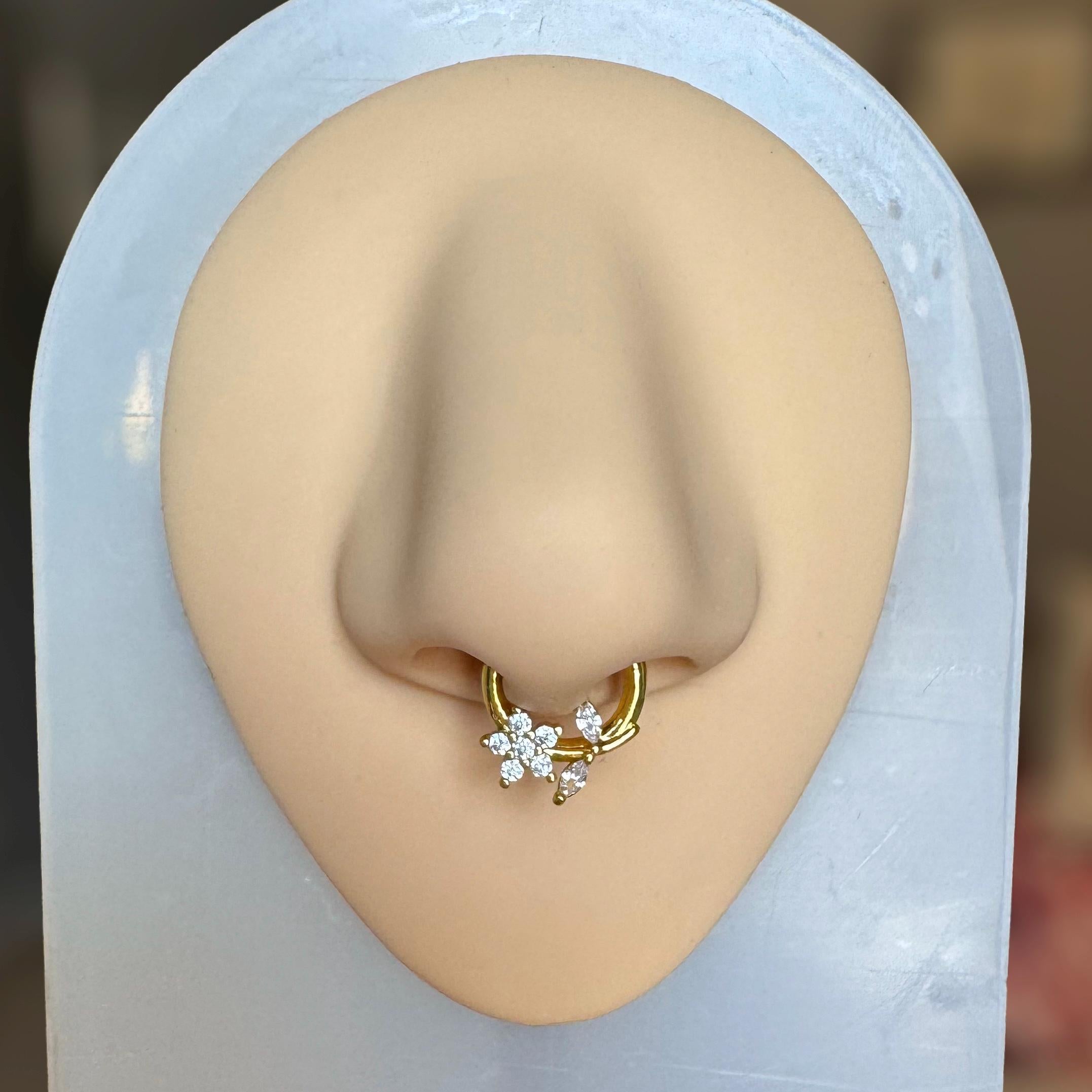 Add a touch of romantic sparkle to your look with this CZ flower septum ring, crafted from polished surgical steel for a sleek, elegant finish. Designed with a delicate floral motif, this piece is adorned with brilliant cubic zirconia stones, arranged to create a graceful bloom that shimmers softly from every angle.