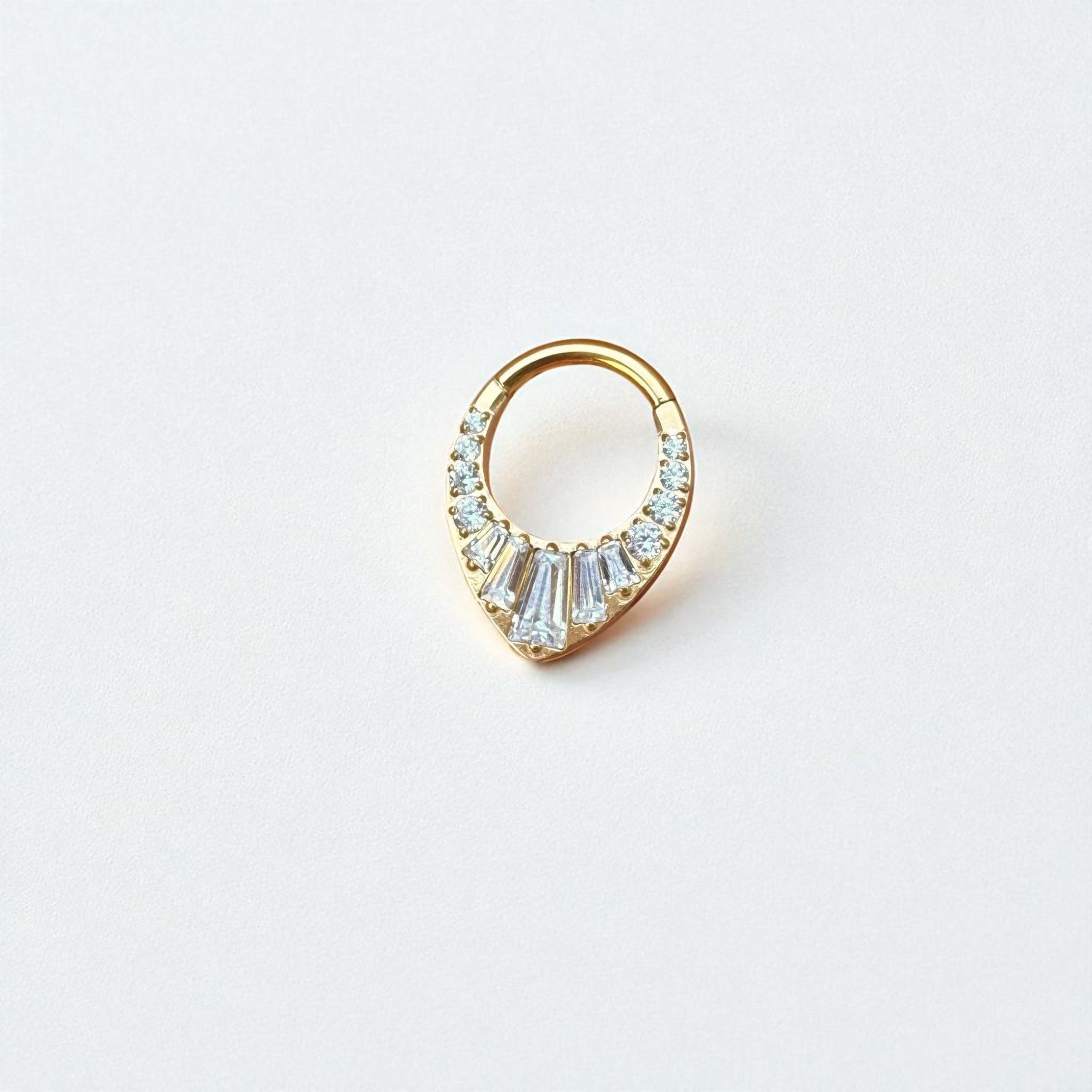 Elevate your style with this exquisite titanium daith earring, crafted to dazzle and delight. Available in silver or gold, this piece features shimmering cubic zirconias that add glamour to any look.