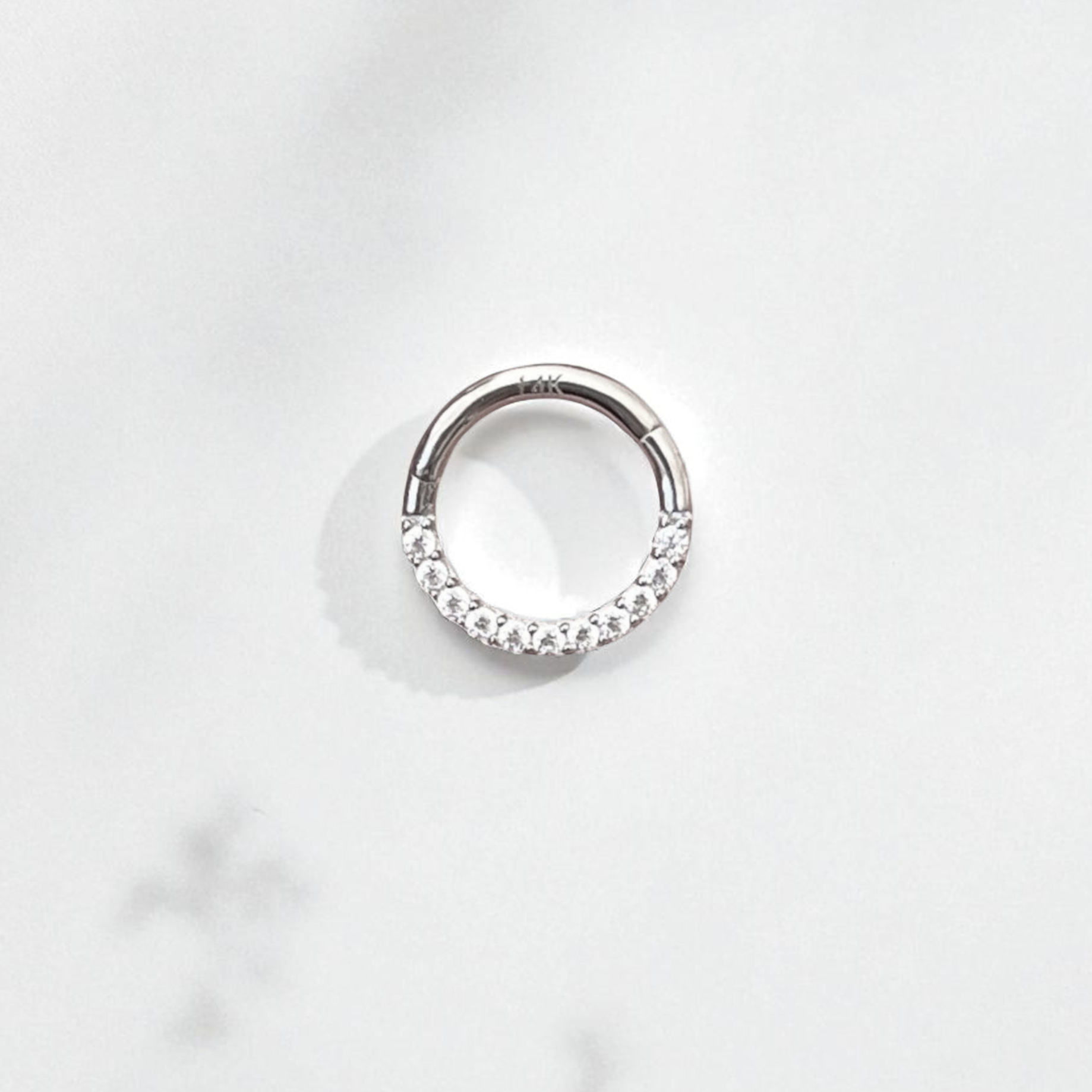 This daith earring is crafted with 14K gold and features CZ crystal accents. Its efficient design makes it easy to insert and remove, and turns heads with its delicate, minimalist style.