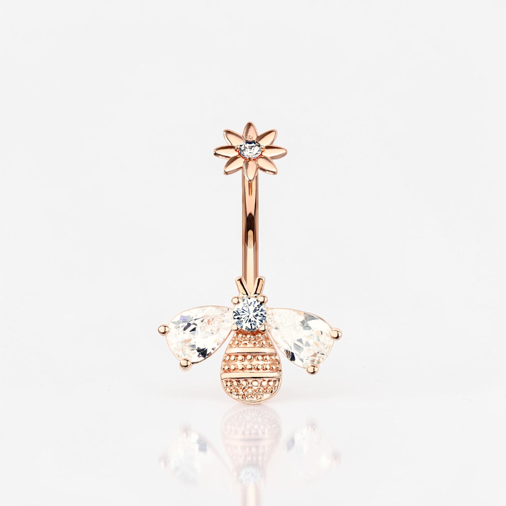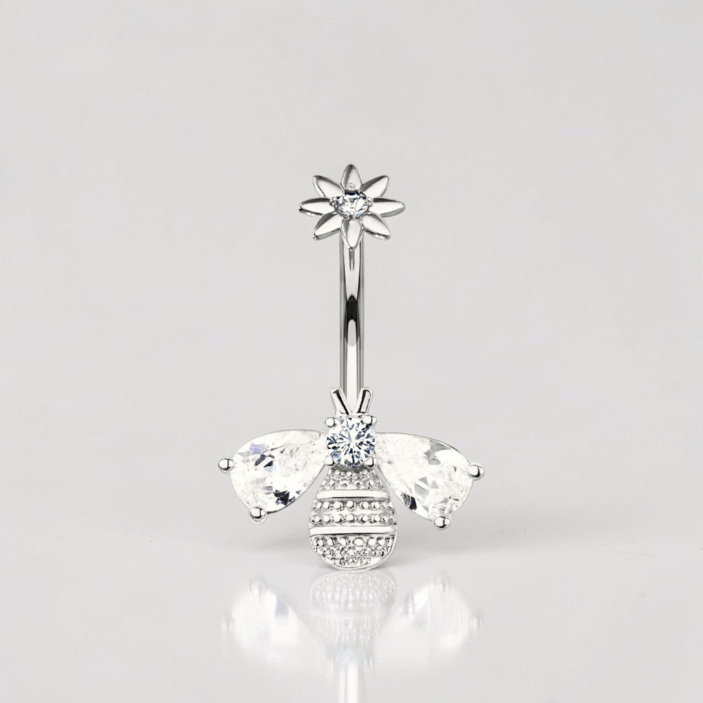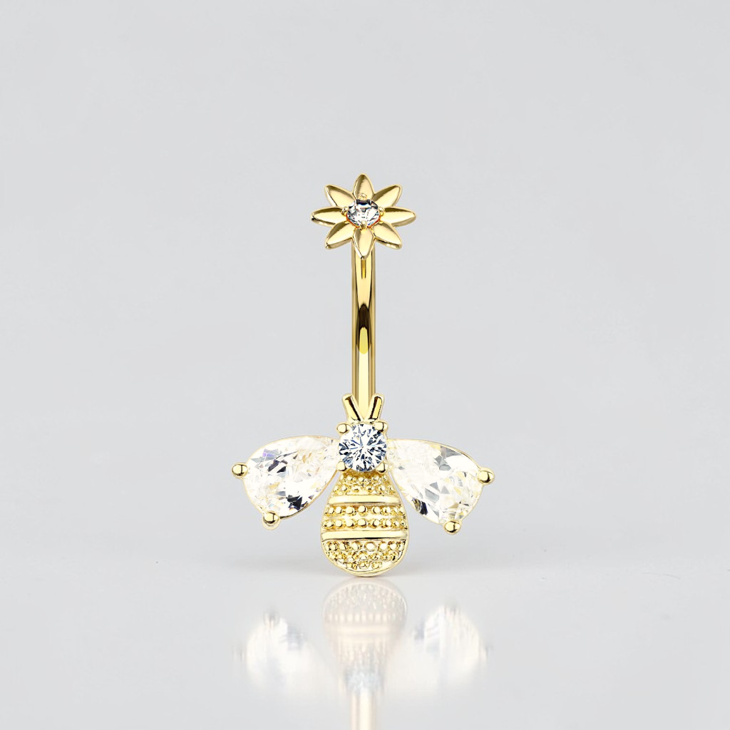 Sweeten your style with this adorable bumble bee belly button ring, designed to bring a touch of charm and sparkle to your everyday look. Featuring a dainty crystal-studded bee and a delicate floral mount, this internally threaded belly ring combines whimsy with elegance in a perfectly petite design.