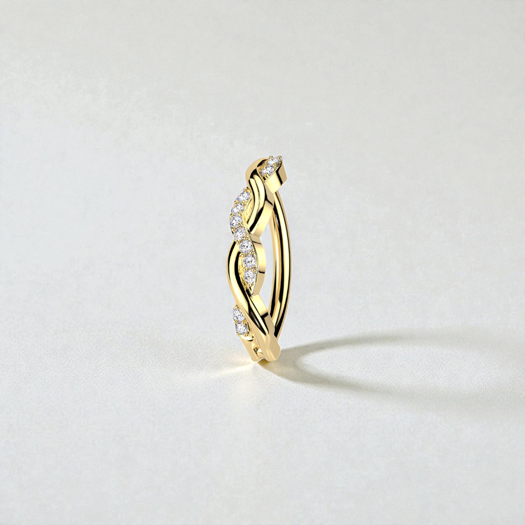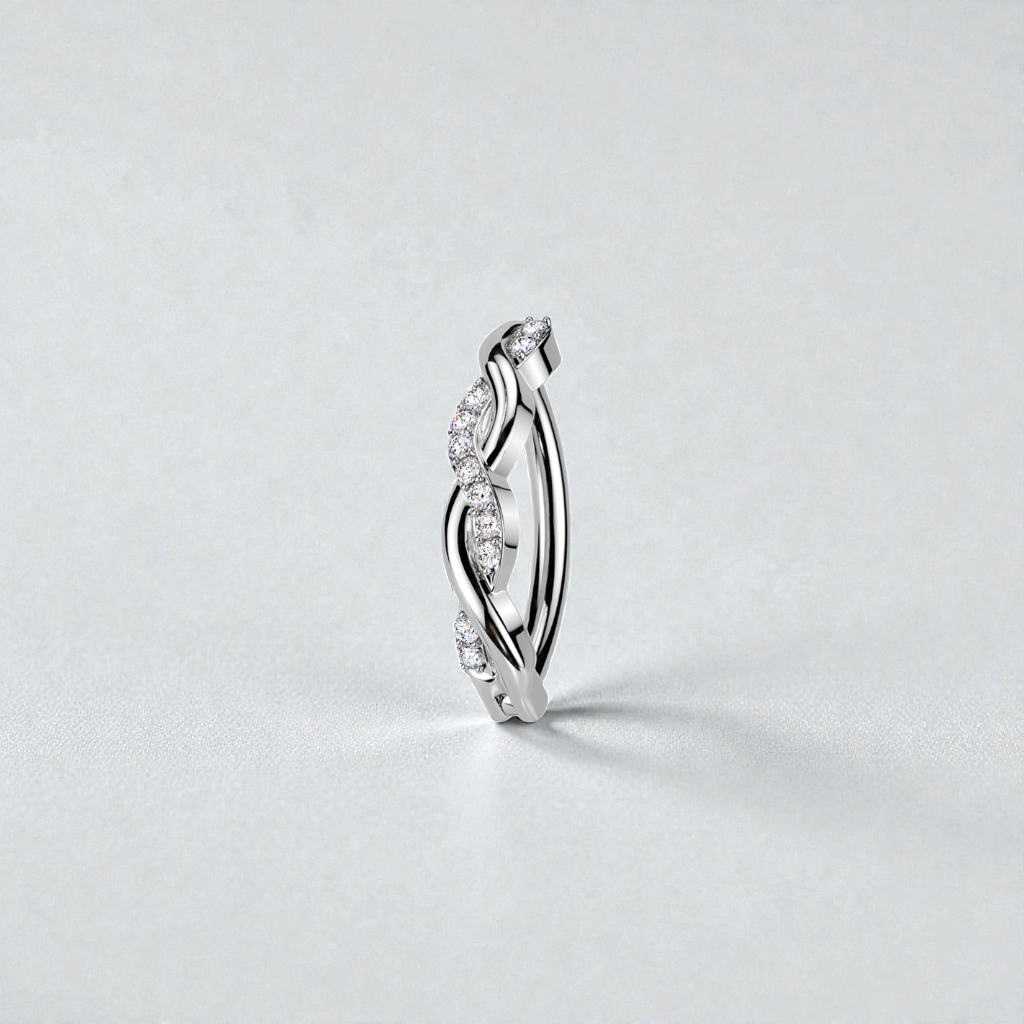 Sleek with a touch of shimmer, this hinged belly button ring features an elegant intertwined design that blends smooth, polished metal with a delicate row of pavé-set CZ stones.