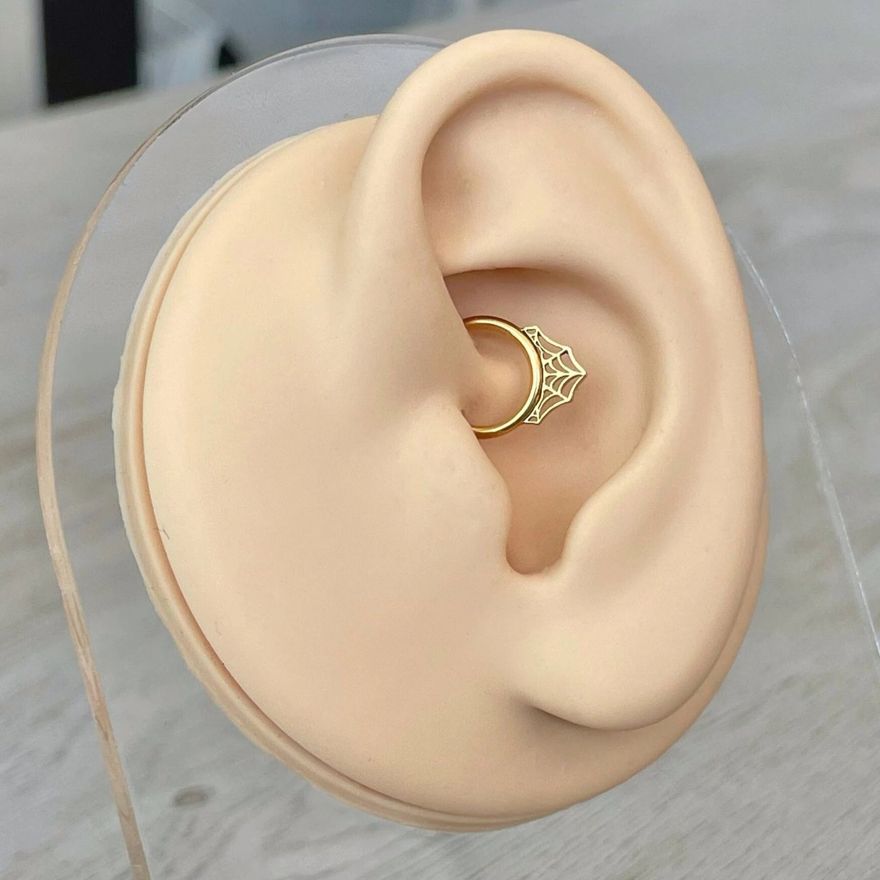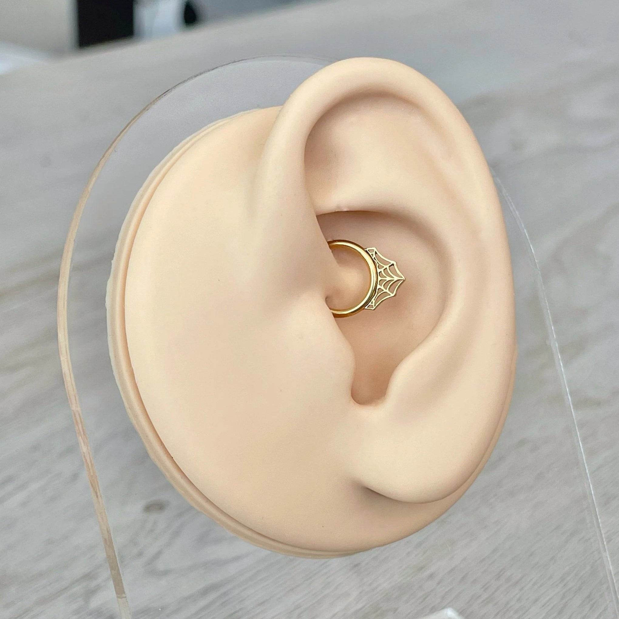 Delicate yet daring, Lace de Minuit captures the artistry of a spider’s web reimagined in stunning elegance. This daith earring features an intricate woven design, accented with subtle sparkle that shimmers like threads of moonlight. Crafted from high-quality surgical steel and finished in a radiant gold or silver tone, it offers both durability and refined luxury.