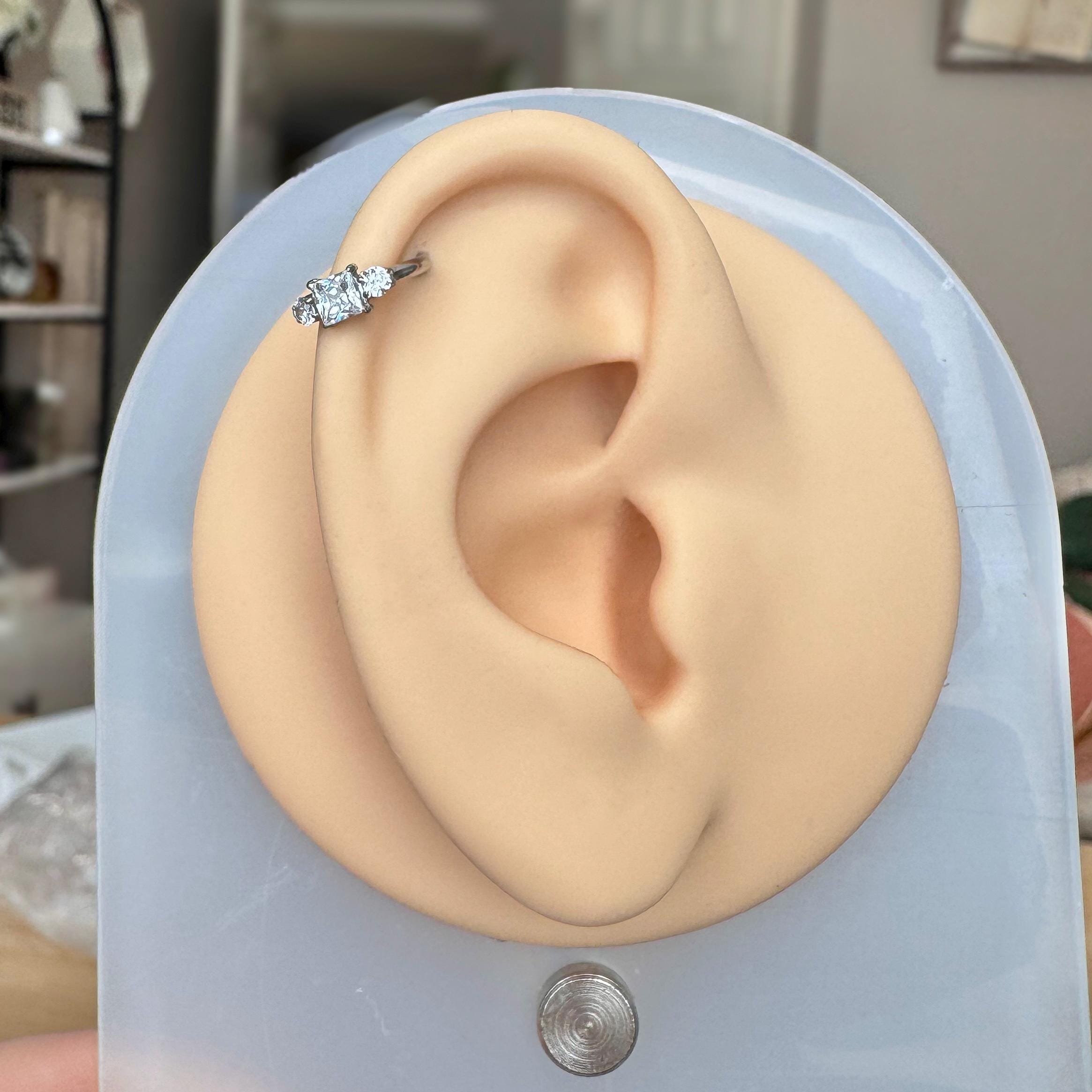 Enhance your conch piercing collection with this elegant clicker earring, crafted from high-quality implant-grade titanium and featuring a stunning cubic zirconia (CZ) design. This piece offers the perfect blend of durability, comfort, and sparkle, making it an ideal choice for cartilage piercings, including helix, conch, and more.