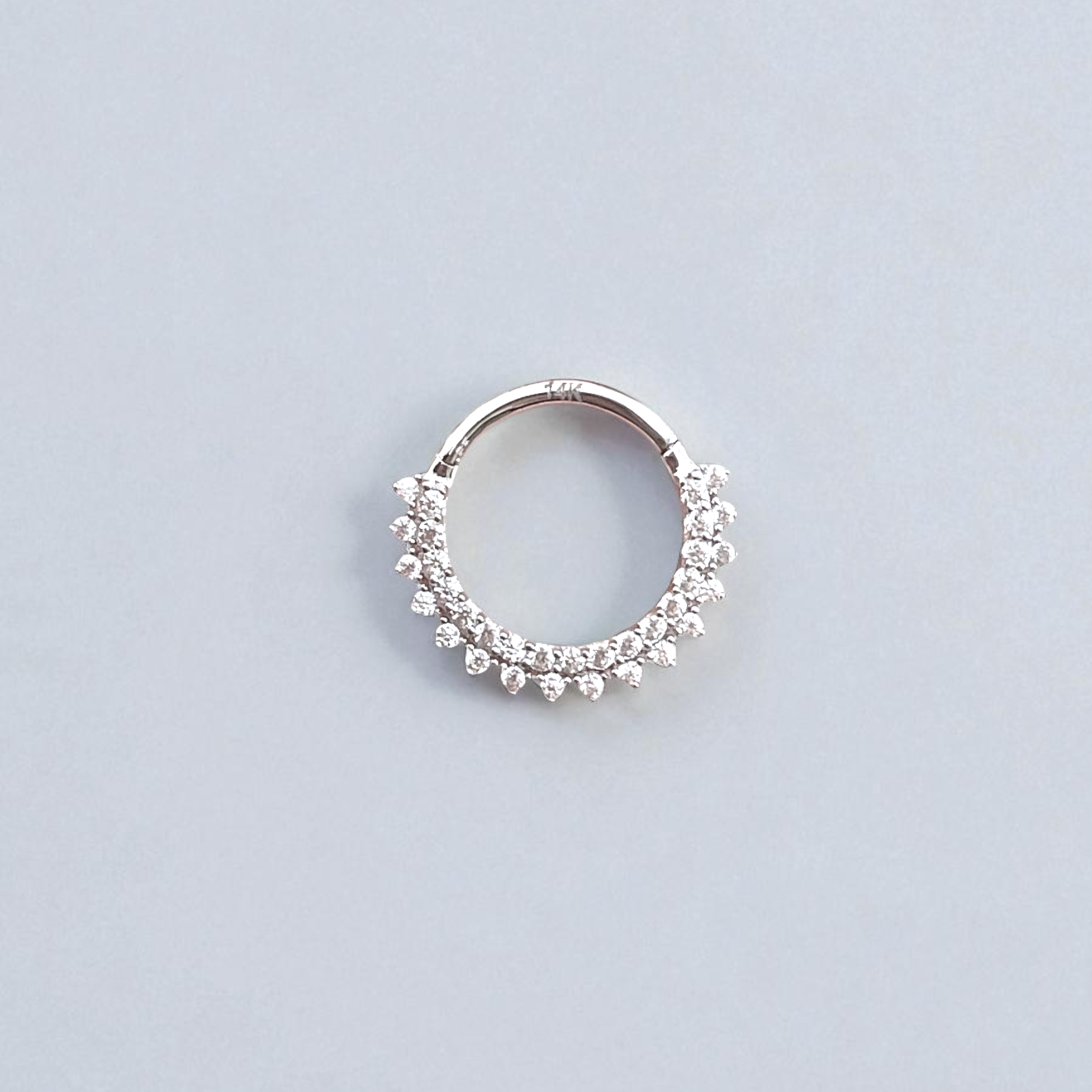 Radiate timeless sophistication with this exquisite 14K solid gold septum ring, available in your choice of yellow gold or white gold. Designed with a graceful halo of brilliant CZ crystals, this piece captures light from every angle—creating a radiant, fan-inspired shimmer that beautifully highlights your piercing.