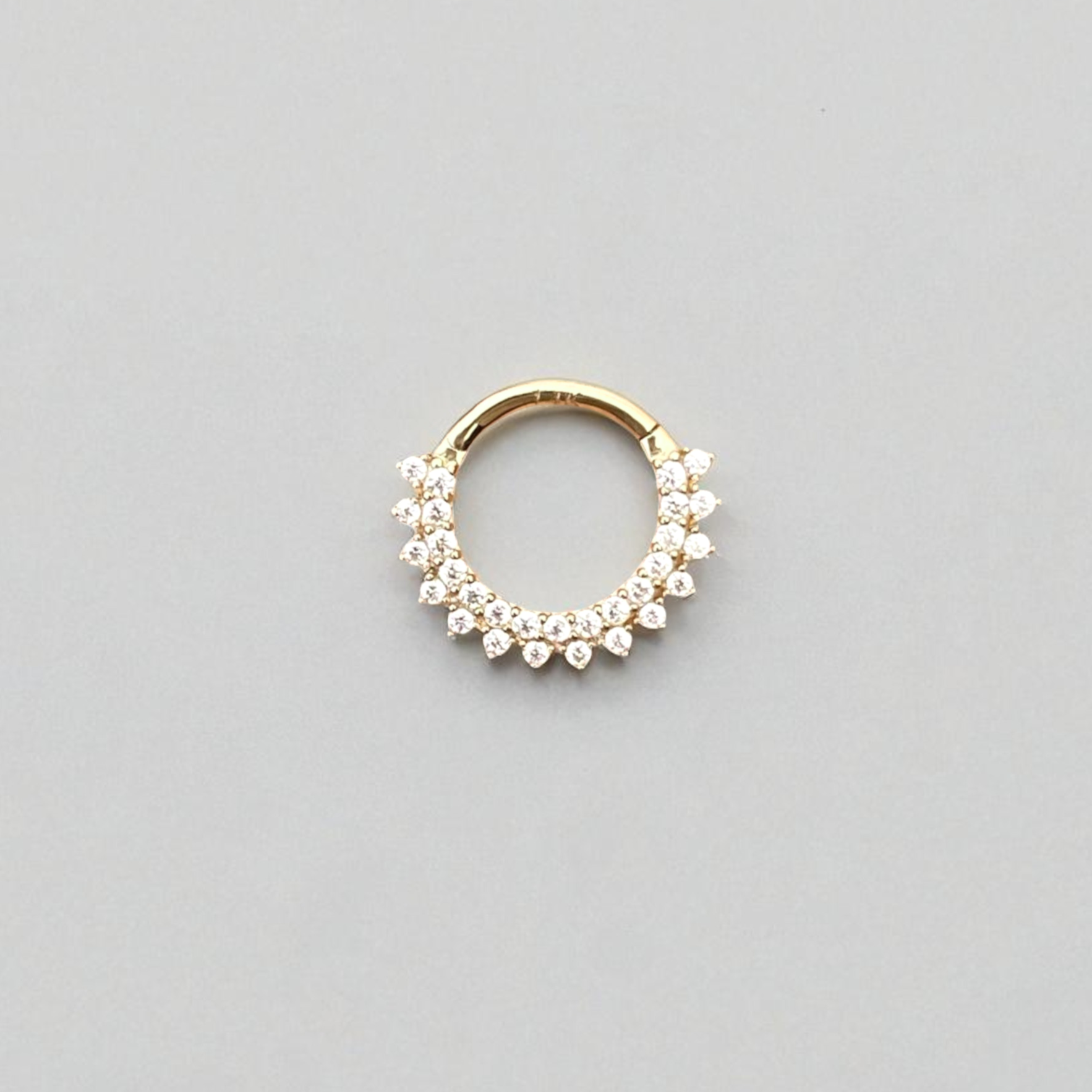 Radiate timeless sophistication with this exquisite 14K solid gold septum ring, available in your choice of yellow gold or white gold. Designed with a graceful halo of brilliant CZ crystals, this piece captures light from every angle—creating a radiant, fan-inspired shimmer that beautifully highlights your piercing.