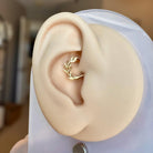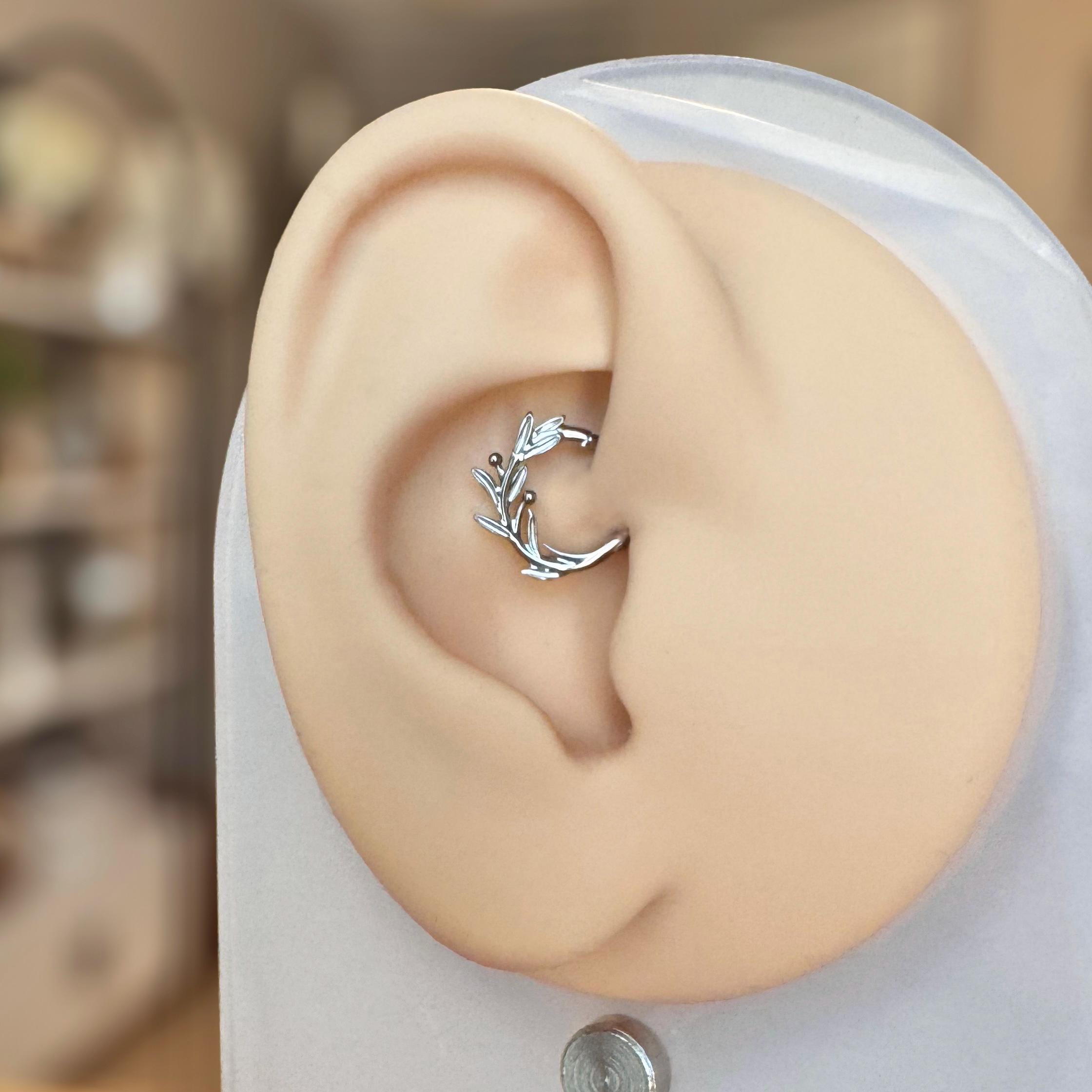 Elegant, symbolic, and effortlessly refined, this titanium daith earring captures the beauty of nature through a delicately sculpted olive branch design. Each curve of the branch is detailed with graceful leaves that reflect the light beautifully, creating a soft, organic shimmer that feels timeless and meaningful.