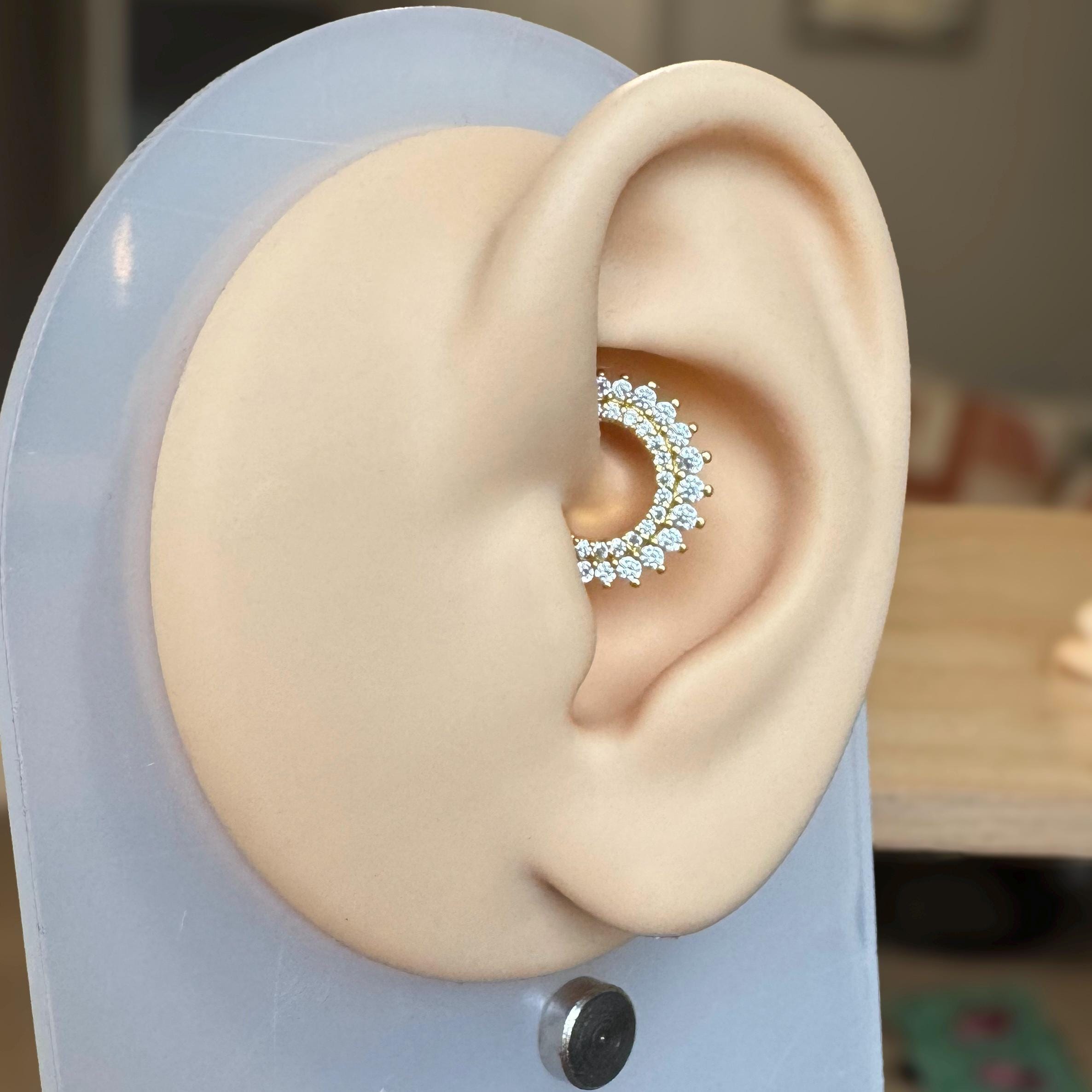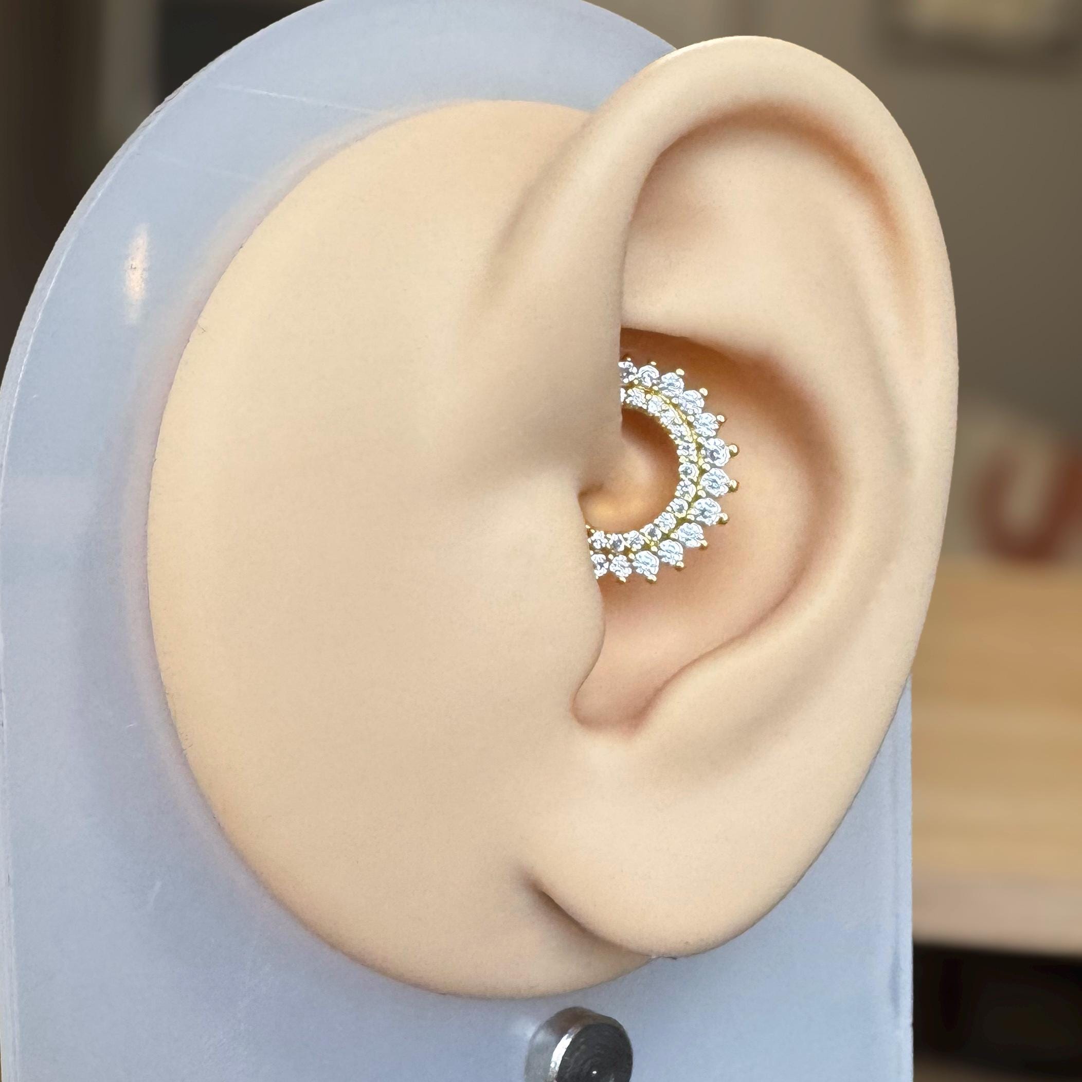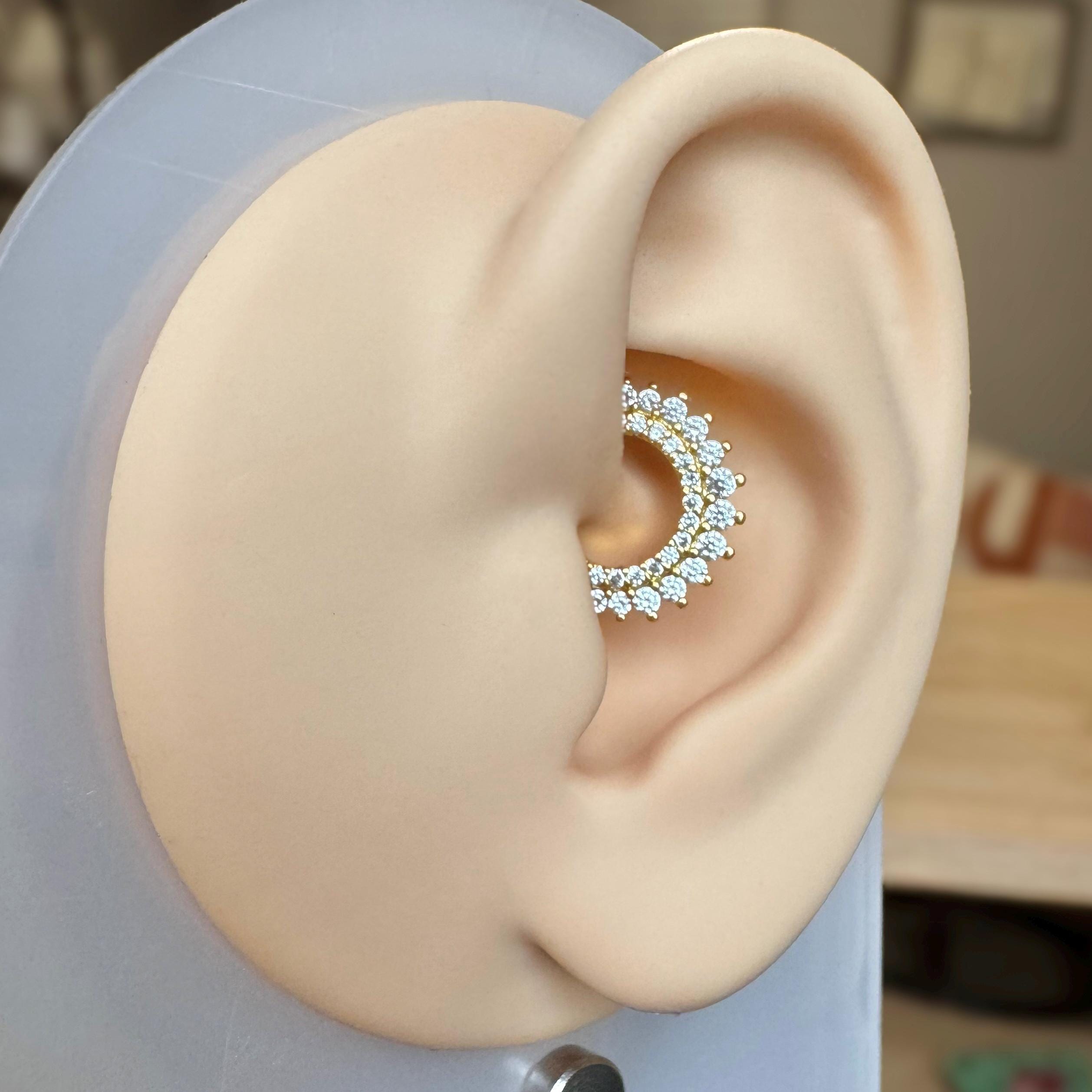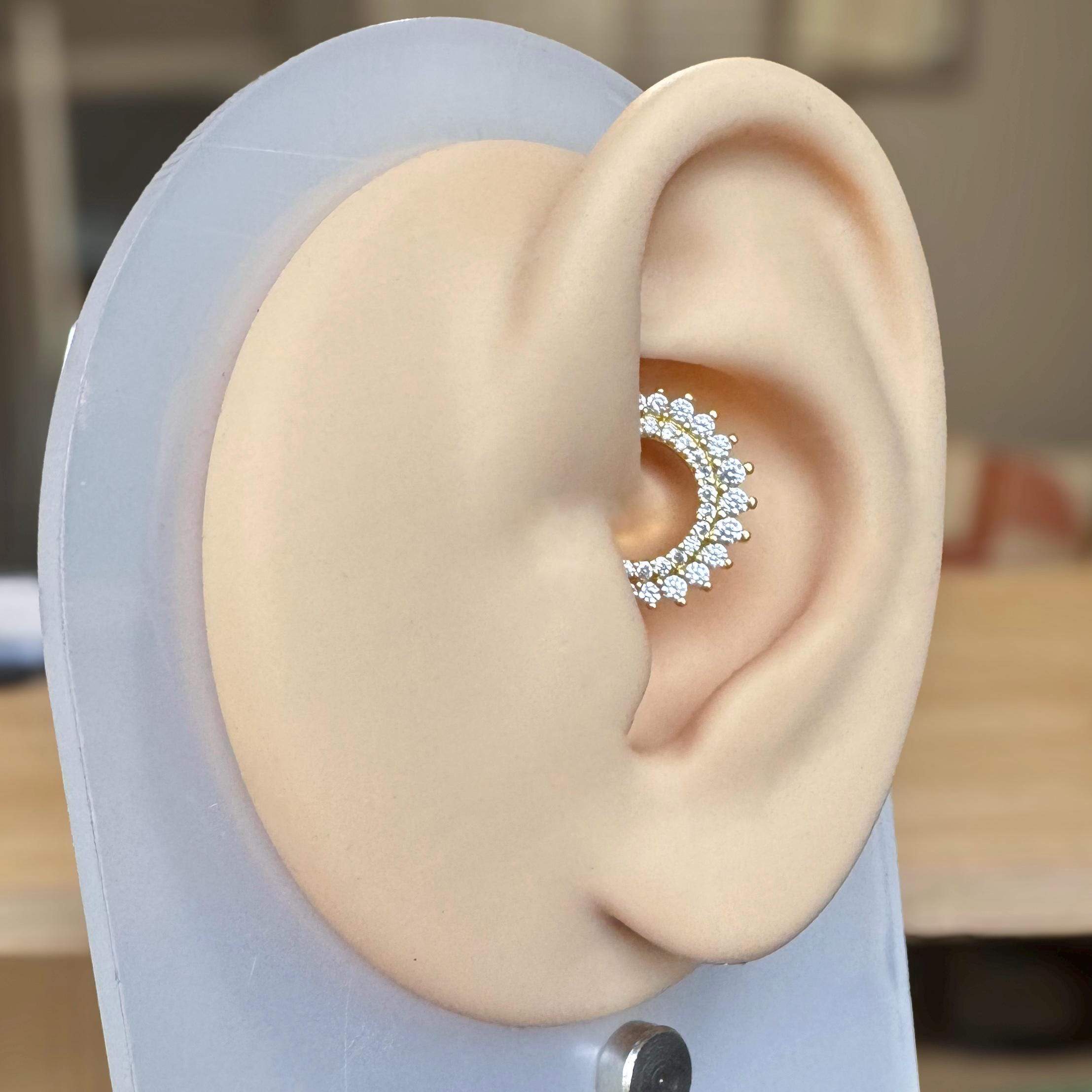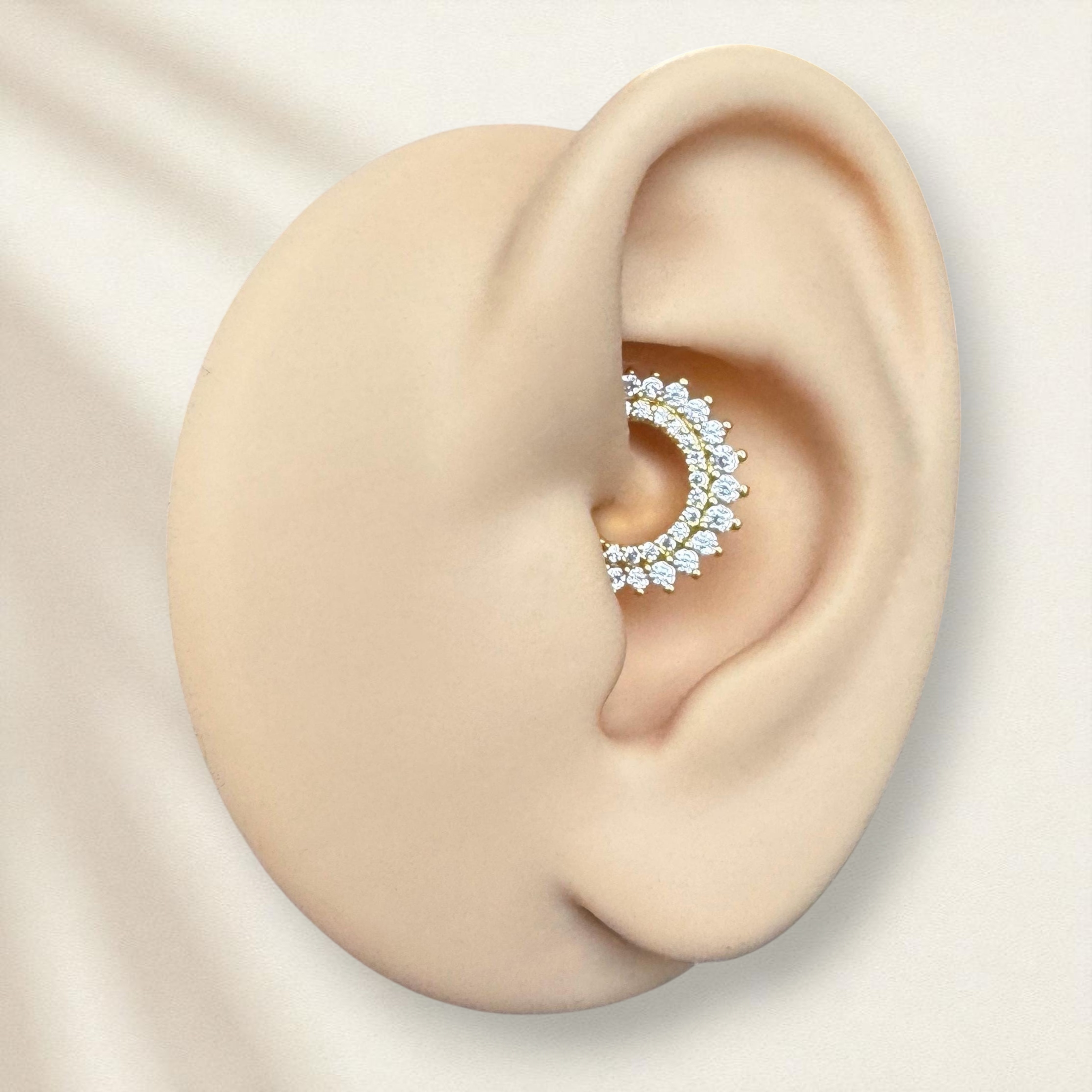 The curved design hugs the ear comfortably, making it ideal for daith piercings while staying secure and lightweight enough for everyday wear. Each cubic zirconia is precisely set to mimic the shimmer of sunlight, creating a dazzling burst of shine that instantly elevates your look.