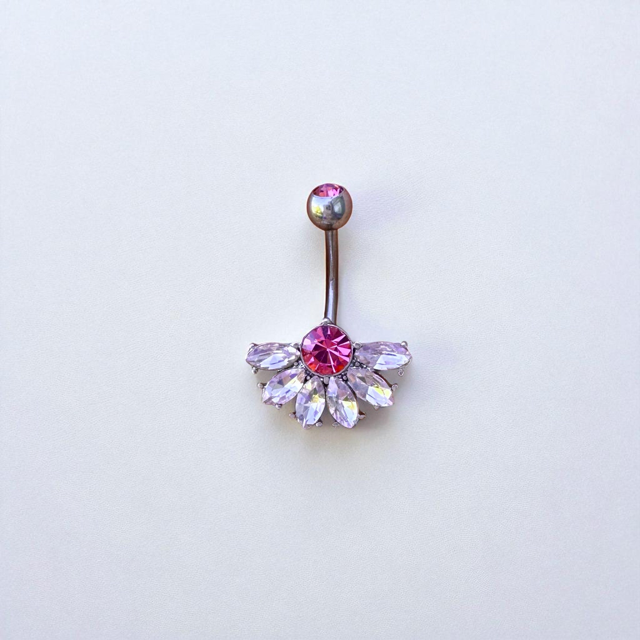 Infuse your belly button jewelry collection with elegance and sparkle with this pink crystal fan designed belly button ring. Expertly crafted from 316L surgical steel, this piece ensures durability and comfort for seamless wear.