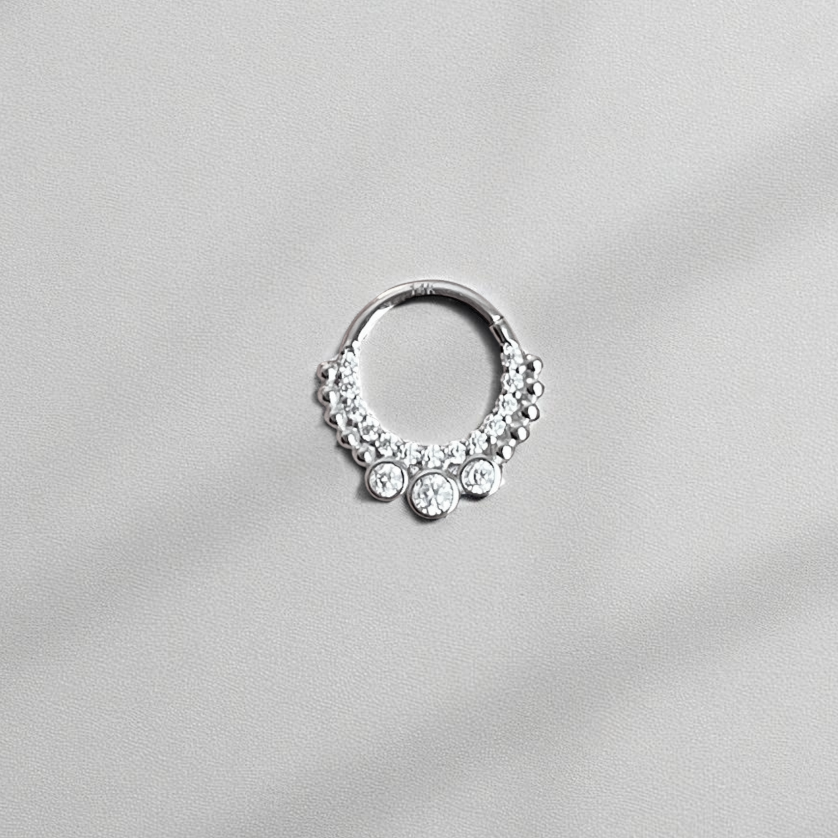 This sleek 8mm septum piercing is crafted from 14K solid gold and features cubic zirconia crystals. Its secure click-in mechanism ensures a snug fit and a minimalistic, eye-catching look.