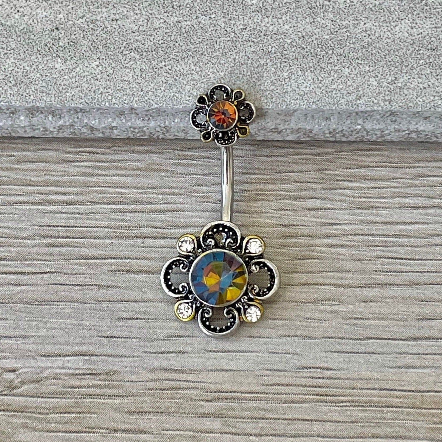 The minimalist yet striking floral design creates a soft, elegant look that’s perfect for everyday wear, while the subtle color-shifting stones offer a touch of magic. Whether you're seeking a delicate and feminine piece for daily wear or something special to elevate your navel jewelry collection, this flower belly button ring is the ideal choice.