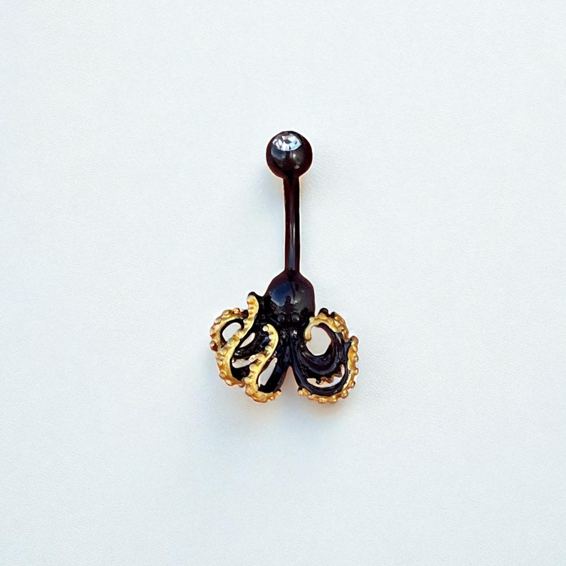 Make a bold yet elegant statement with this unique Octopus/Kraken belly button ring. Featuring a striking solid black color with intricate gold details, this piece effortlessly combines edgy design with a touch of sophistication. This Octopus design adds a mystical, oceanic vibe to your piercing.