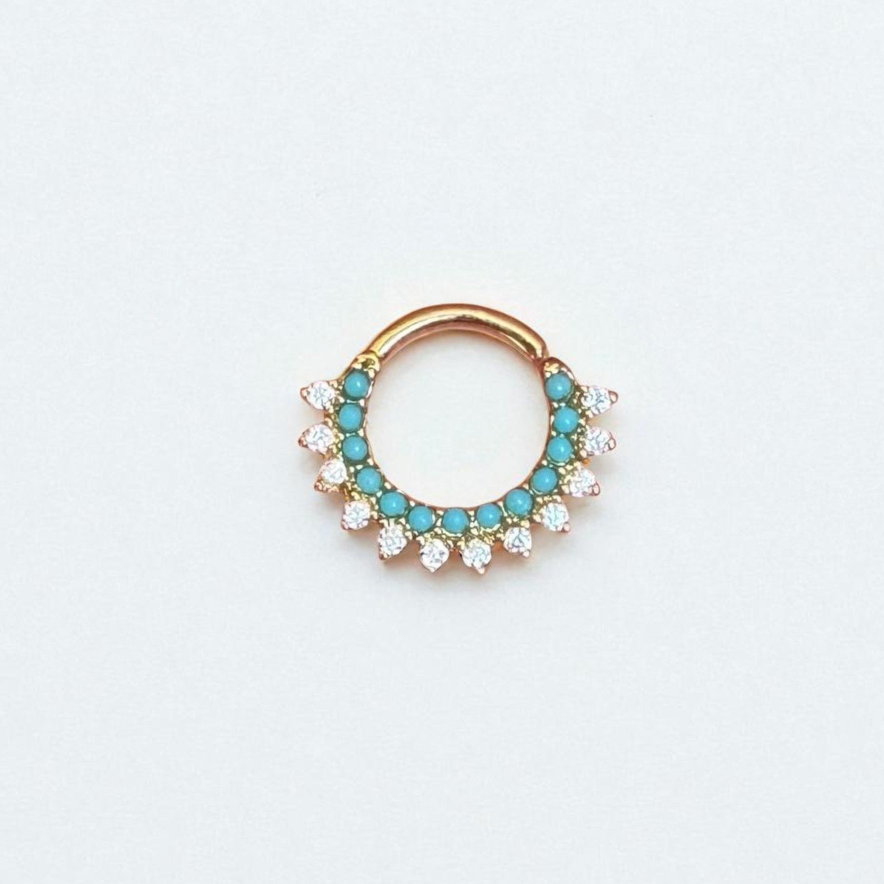 Style meets comfort with this bendable daith earring featuring striking synthetic turquoise and sparkling CZs in a fan design. Handcrafted for versatility and comfort, this unique piece is perfect for those looking to effortlessly elevate their everyday look or add a touch of flair to any occasion.