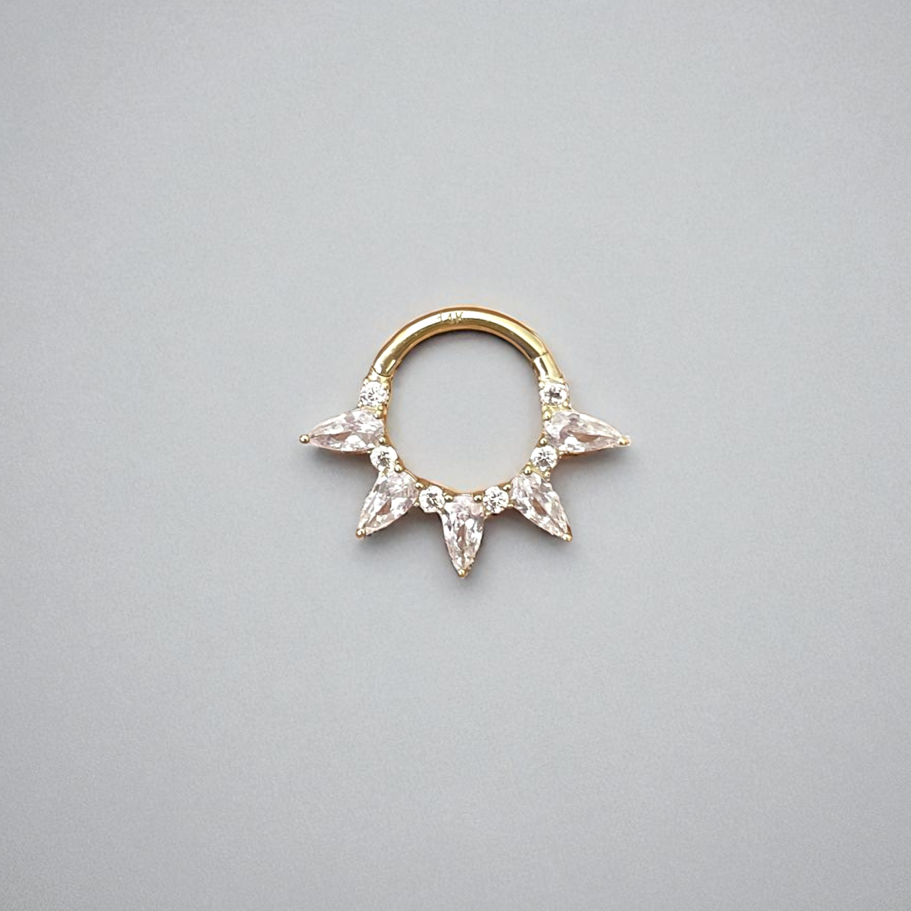 This septum clicker is made of 14K solid gold and features CZ marquise crystals. Its delicate and sparkling design makes it a perfect choice for everyday wear.