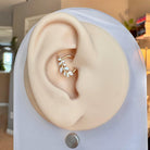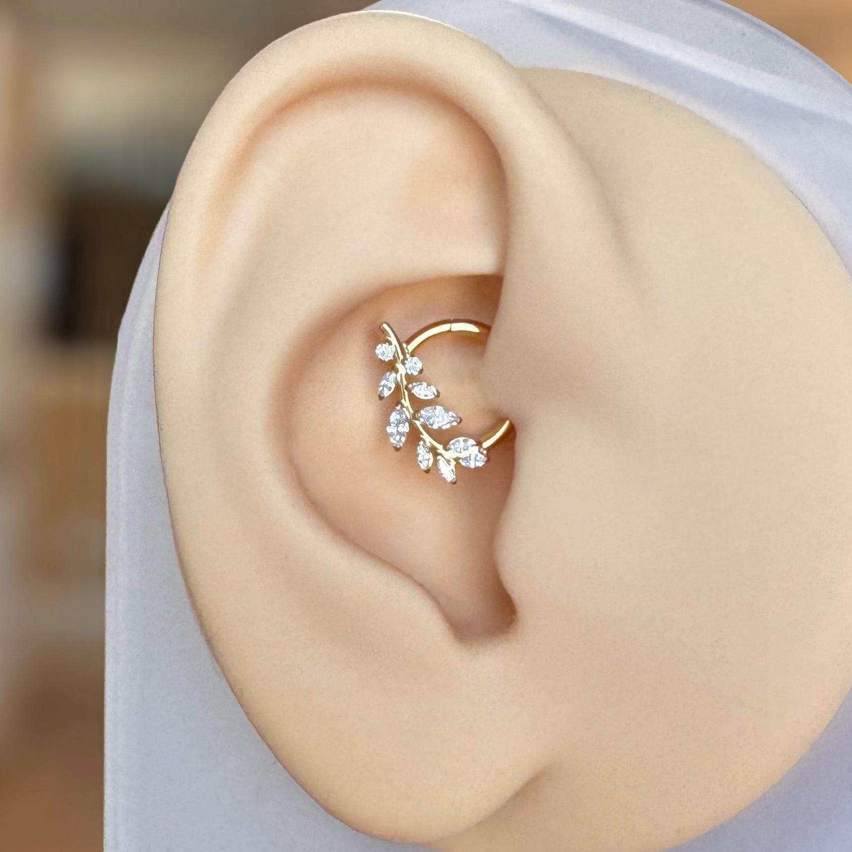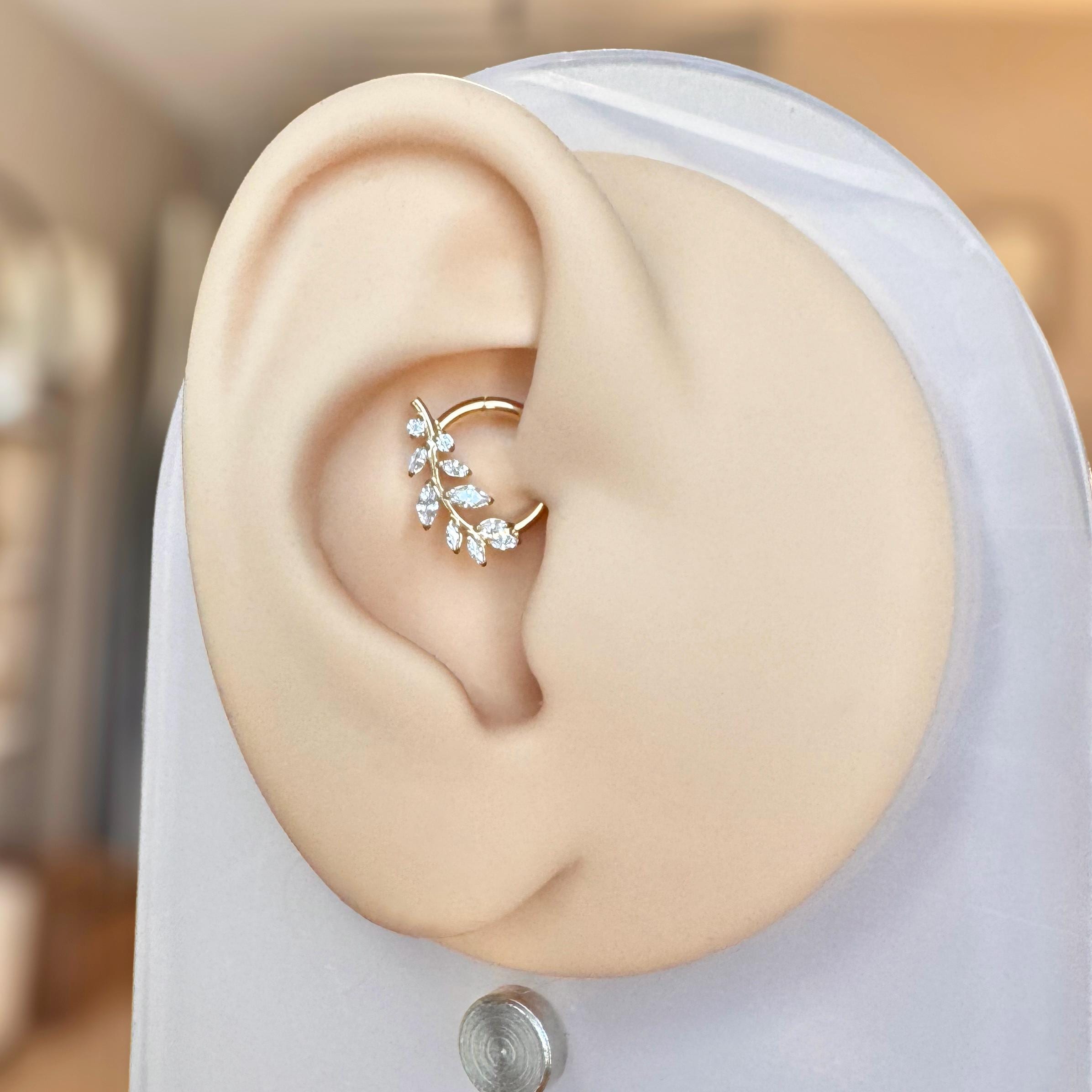 Inspired by nature’s quiet elegance, this titanium daith earring features a graceful branch of marquise-cut CZ stones arranged in a delicate leaf pattern. Crafted from implant-grade titanium, this piece is lightweight, and made for lasting comfort. The hinged clicker closure ensures a smooth, secure fit for everyday wear. Available in your choice of silver or gold, it blends versatility with luxury—perfect for any ear curation.