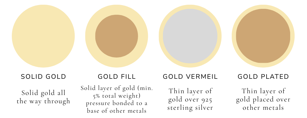 Gold fill is a high-quality alternative to solid gold at a more accessible price point. It consists of a thick layer of genuine 14k gold that’s pressure-bonded to a durable base metal. Unlike gold plating, gold fill has significantly more gold content and won’t flake, peel, or rub off. It's safe for sensitive skin, tarnish-resistant, and designed to last for years with everyday wear—even in water!